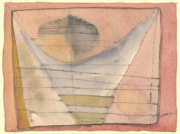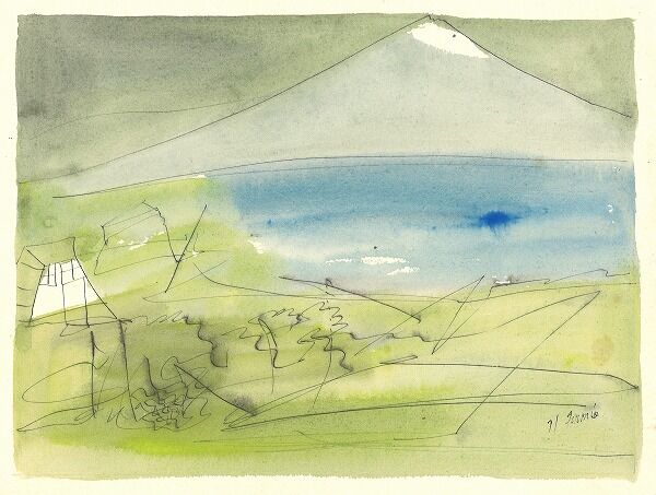 難波田史男 《山と湖》 1971年 紙、水彩、インク