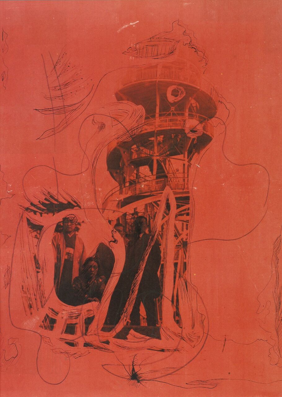 《多摩園》のもうひとつの特徴である、「焼き付けされた印画紙の上からの描画」もまた、型紙と同様に、表現が成立する過程を原理的に考察することによって、有効な論点が導かれる。具体的なイメージとは別なレイヤーとしてとらえることができる、印画紙の上からの描画、主として黒い描線は、瑛九のフォト・デッサンに特徴的な、フリーハンドで自由に画面上を行き交う線的な要素を、想起させはしないだろうか。そう、懐中電灯による描画のような線である。