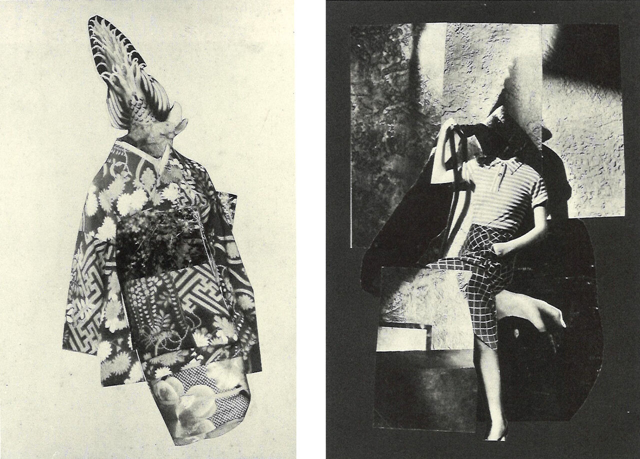 このことから、瑛九のフォト・デッサンやコラージュにおいて重要な、あることが、想起されはしないだろうか。瑛九のコラージュには、顔が不在である作品が存在する(fig.4、fig.5)。複数のイメージを切り貼りする技法からすれば当然であるが、そうした作品では、人体は操作可能な「かたち」として扱われる。また、フォト・デッサンにおいては、型紙が想起されるだろう。型紙における「人」の表現は、まさに「人型」であり、体の輪郭が平面的に切り取られ、切り抜かれる。そこに、個人を象徴する「顔」は不在である。