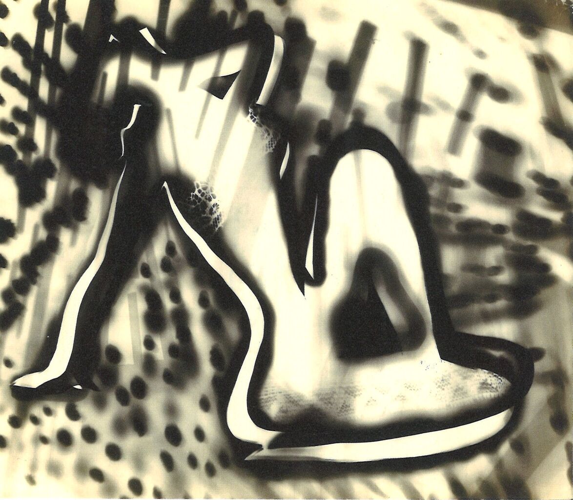 型紙による構図が画面全体の基調をなしており、明るく抜けているエリアでは、植物の葉のイメージが確認できる。その点では、前回紹介した《題不詳》や《作品(23)》と、同じ特徴が指摘できる。だが、さらによくこの作品を見てみると、気になってくることがある。画面の左側に注目すると、型紙によって明るく抜けているエリアにおいて、植物の葉のイメージの背後に、おぼろげながら、何らかのイメージが見えている。