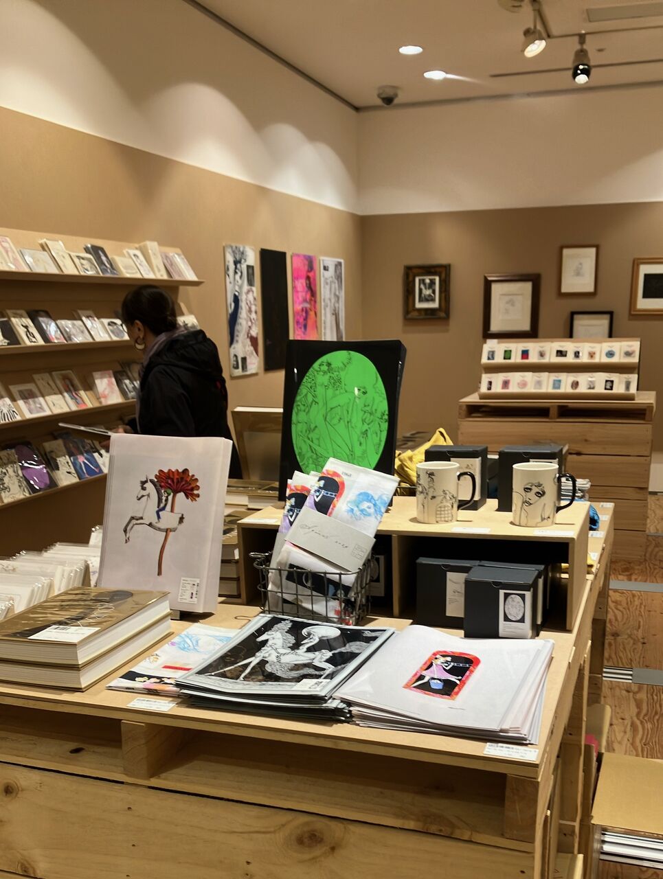 展覧会のオリジナルグッズも多数。写真を撮影していると宇野先生ご本人がいらっしゃり、ハンカチを広げてご覧になっていました