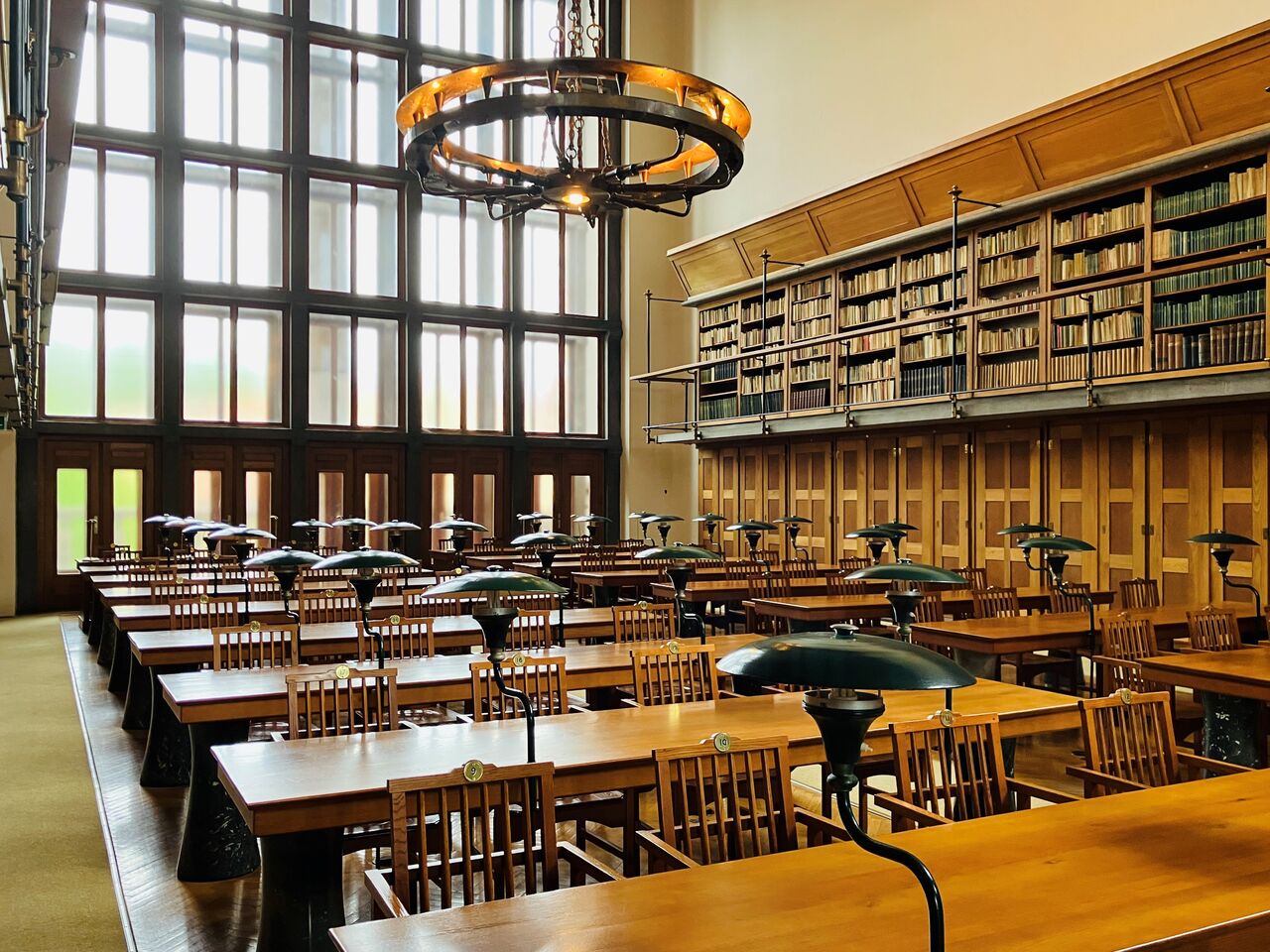 なんというか。。クラシックな空間であるのには間違いないのだけれど、モダンな空気が流れていると言ったらいいのか。建物の細部を見ると今の時代からすると、装飾が多いのですが、全体として感じ取れる空気感のようなものはとても爽やかです。階段ホールは石材の色合いからどちらかというと静的で、直通の階段が威厳すら感じさせたのですが、図書室は木材に囲まれ、先ほどとはかなり対照的な雰囲気。