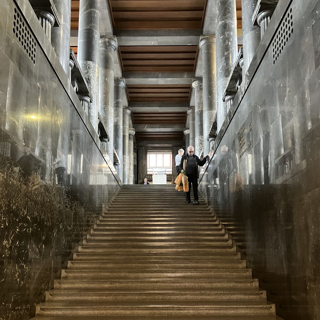 図書館は閉館していたようなのですが、ビジター用の時間帯が設定されていて、間に合って入ることができました。入るとまず、大きな階段があり、上がっていくとそこには階段を中心としたホールの空間があります。そして、先には図書室がありました。