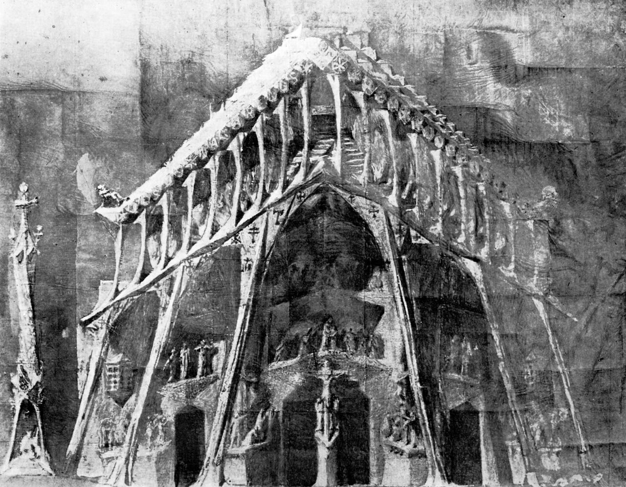 戦後建設続行した建築家たちは、紙のものは全てスペイン戦争で焼かれていたので、壊れた石膏の模型の断片を繋ぎ合わせて、ガウディのサグラダ・ファミリアの構想を再構築するという労力を課せている。これは言ってみれば遺物を捏ねまわす考古学的な手法であった。しかし、ガウディは常に新しい試みを考えだし、試行錯誤の末に石に刻んでいった建築家だったわけで、明らかに相反する手法で建設が進んでいる。