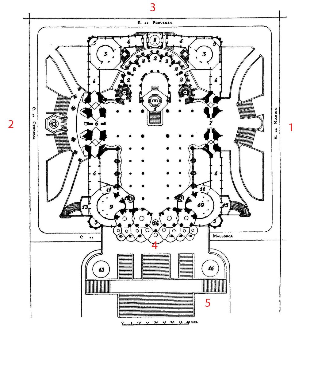 全体のプラン (1が誕生のファサード、2が苦難のファサード、3がアプス、4が正面になる栄光のファサード、5が大階段となって、マジョルカ通りを跨ぐ)