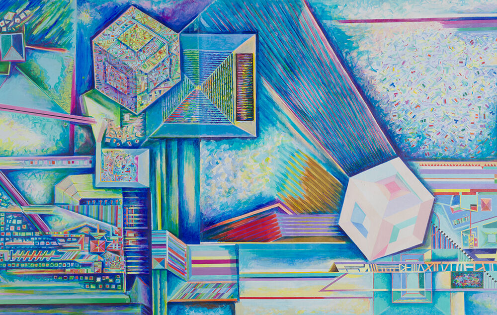 今回の展示は限られた点数の《City》シリーズであったが、3種類の傾向が見られた。一つは、限定的な色彩と余白を使って、俯瞰で見た地図のような、平面的に抽象的に表されていた都市。二つめは、多彩で強い色が用いられるようになり、立面的あるいは立体的に、時に透視図の視点で、ビル群が縦に伸びるようすが表されたもの。三つめは、都市やそのインフラを支える情報社会のネットワークやコンピューター内部の回路を表すような視点。実際、拡大レンズを装着しながら描く木村の姿が写真に残っている。それらの3段階の変化には、木村が渡米してニューヨークで間近に体感した同時代のアメリカ美術動向であるプレシジョニズム、ポップアート、オプティカルアート、サイケデリックなどからの影響は十分に考えられ、木村の主題である都市と木村自身との主観的な距離の変遷のようにも感じる。