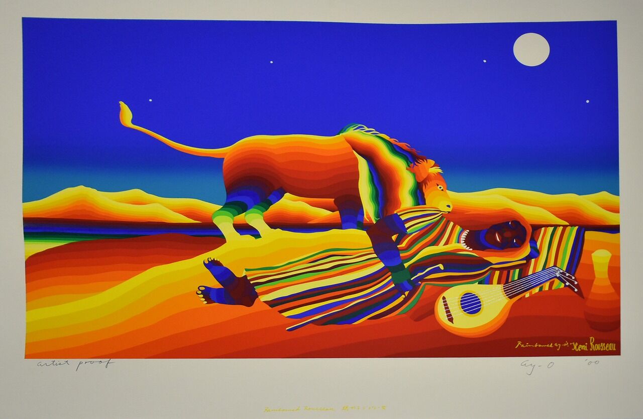 <ときの忘れものにて靉嘔展へ。くっきりと目立つ虹グラデーションの配色や鳥が題材として有名ですが、それ以外の作品も展示。階段スペースに広がるタペストリーのサイズにも、細部の描き込みにも呑み込まれてしまった。なんと到着したタイミングで靉嘔さんご本人がいらっしゃってました。