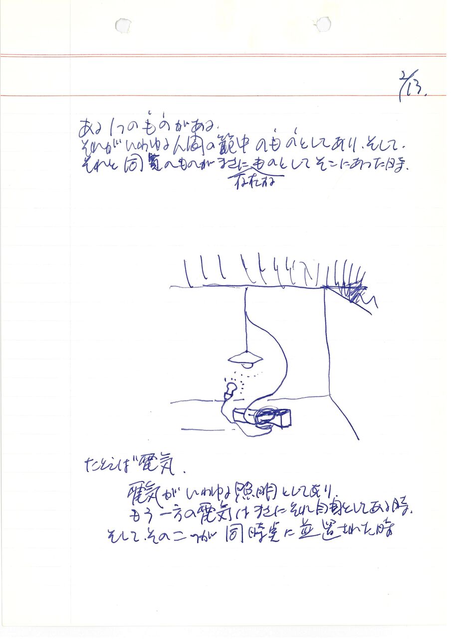 展覧会に向けた調査のなかで様々な興味深い資料に触れることができたが、生前誰にも(家族にすら)見せることなく、没後に見つかった「制作ノート」は、出色の資料である。1960年代末から80 年代前半にかけて記されたこれらの制作ノートには、作品のプランやアイディアに加え、自らの制作のあり方、他の作家の作品に対するコメント、時代状況に対する考え、哲学的な思索が綴られている。特に、もの派期に関わる1969年から数年間にわたる制作ノートは、ひときわ濃密である。異質な物体の組み合わせ、物体に内在する重力やテンションの視覚化、物体の状態やそれが置かれた状況の提示、即物的に光る電球の導入など、もの派の神髄ともいえる具体的なプランが集中的に描かれており、もの派の形成を検証する上で最重要の資料であろう(図7)。制作ノートには実現していない案も多数含まれるが、一連のプランには、ハラルト・ゼーマンが1969年に企画した展覧会「態度が形になるとき」の欧米作家の作品に通じるコンセプトが散見でき、国を越えた同時代性も鮮明に浮かび上がってくる。