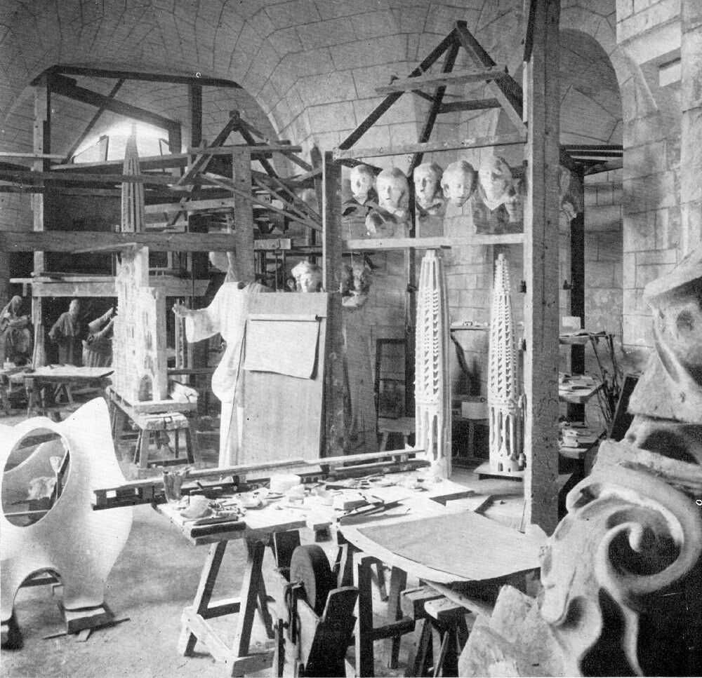 この設計、製作のプロセスは実は彫像群だけではなく、建築でも同じことをしている。柱の形状、柱頭の検討などはもちろん、例えば巨大なアーキヴォールトでさえ原寸で石膏模型が作られ、検討が終わるまでの間、実際に設置される場所に仮置きされていた。