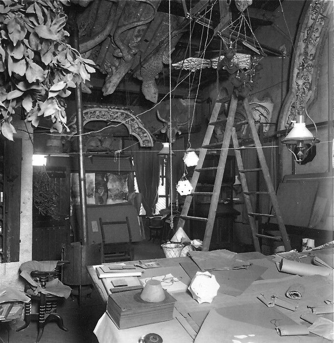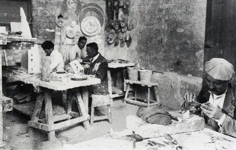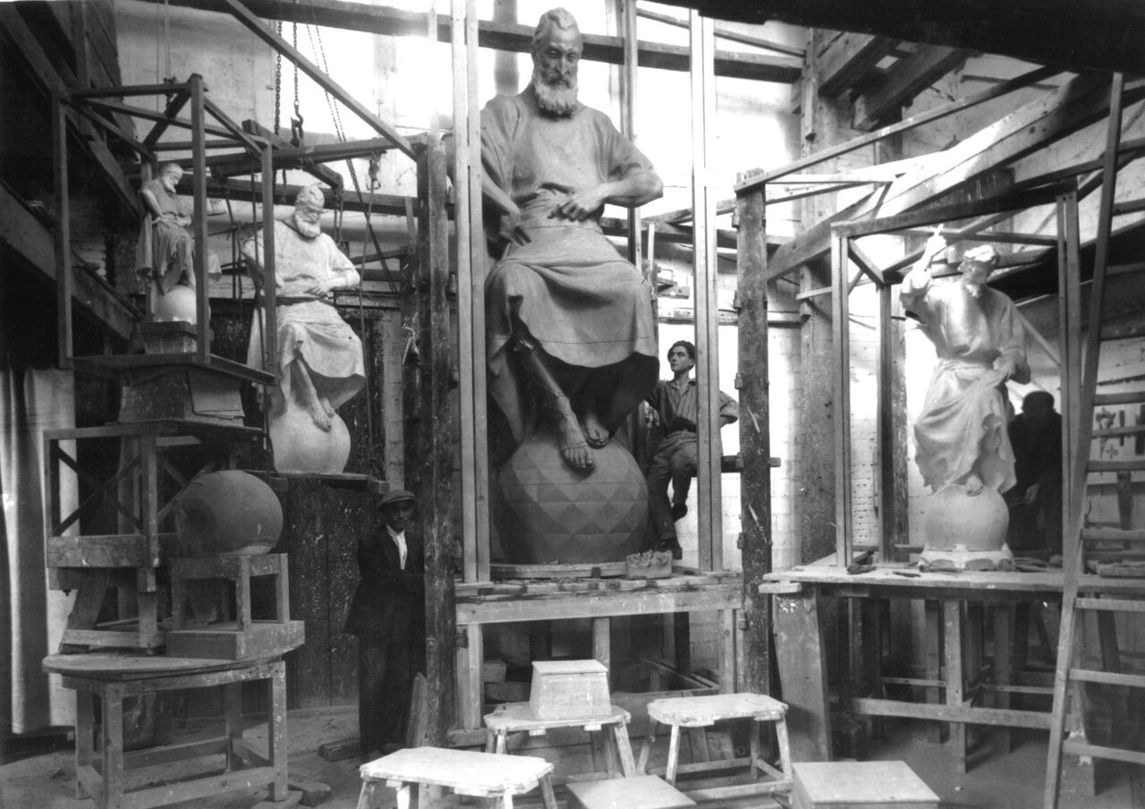 1917年の工房。スーツにネクタイ姿で作業しているのは弟子の一人スグラーニェス