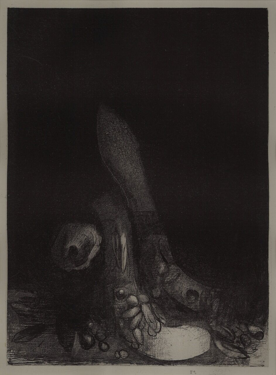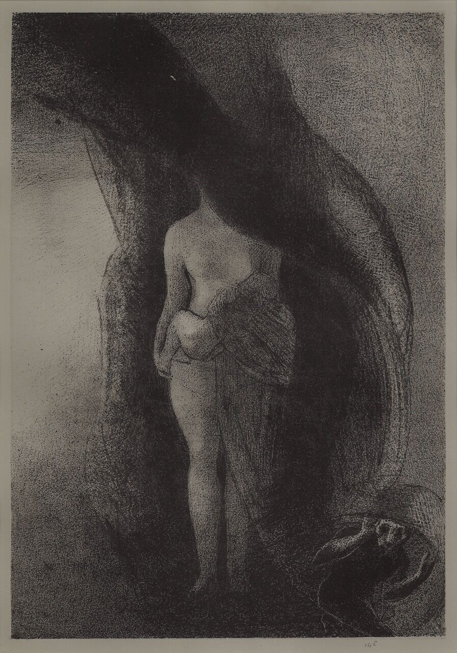 ルドンは『聖アントワーヌの誘惑』を題材に42点(表紙を含む)のリトグラフを制作しました。幻覚を見るような魔的な世界を、自身「あらゆる色彩の中で最も本質的な色」とした黒一色で表現したルドンの代表作として知られています。
