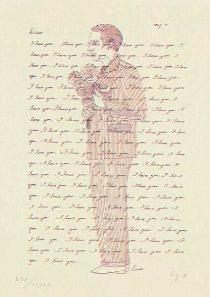 画面中央には、花束を胸に抱き、横向きに立つ正装の男の姿が大きく描かれ、手書きの文字が画面一杯に重ねて摺られている。よく見ると手紙の本文はすべてが“I love you.”の繰り返しで、数えてみると95ある。青、赤、黄の三色のインクで文字をわずかにずらして刷っているので、実際には285回もの「愛している」が木霊よろしく連呼されているのである。
