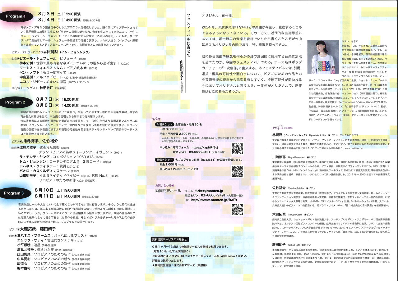 会場では「二次創作」をテーマに、引用・選択・編集の可能性を模索する3つのプログラムを展開。塩見先生の作品が演奏されるのは、8月7日、8日に開催される「Program 2」と8月10日、11日に開催される「Program 3」。配信チケットも各1,000円/1プログラムで販売されるそうです。