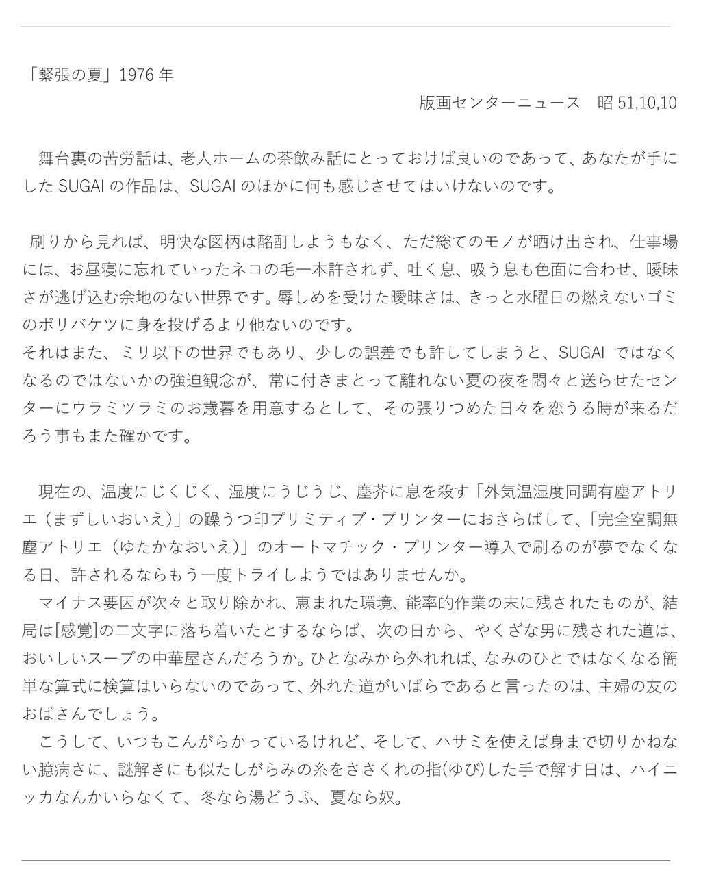 そして、この 13 年後、1976 年の夏は菅井汲・新作 21 点の刷りでひたすら疾走! 版画センターニュースには、その奮闘記?を寄せていました。