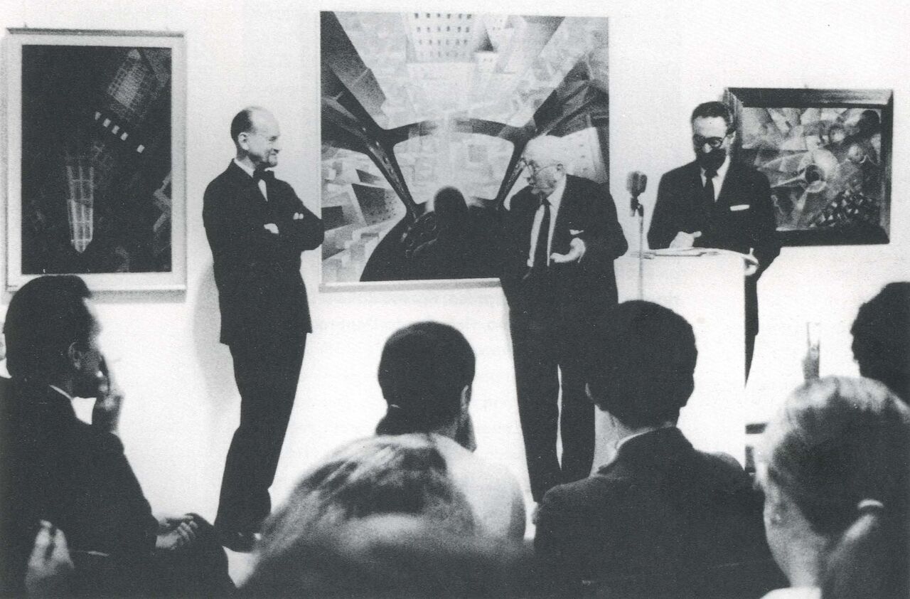 図5:第二次世界大戦後、ミラノ・ブルー画廊で開催された未来派の展覧会で、詩人フランチェスコ・カンジュッロ(1884-1977/中央)と語りあうクラーリ(左)、1970年