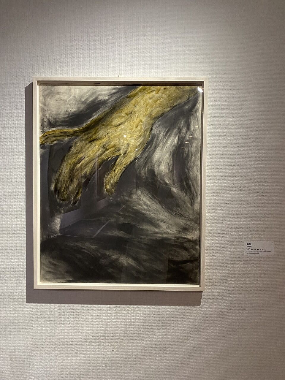 〈触〉シリーズは、キャンバスに下地を塗り、平置きにして、その上に板を渡して乗り、手指に粉末の黒鉛をこすり付けて身体や風景の一部を抽象化し、また宇宙など有機的な形象を描いているそうです。「指紋が摩耗する」ほど魂を込めて描いたことが手の痕跡からひしひしと伝わり、うごめきも感じ、怖いくらいに凄みのある作品です。