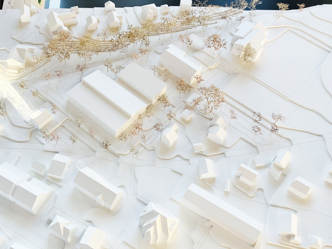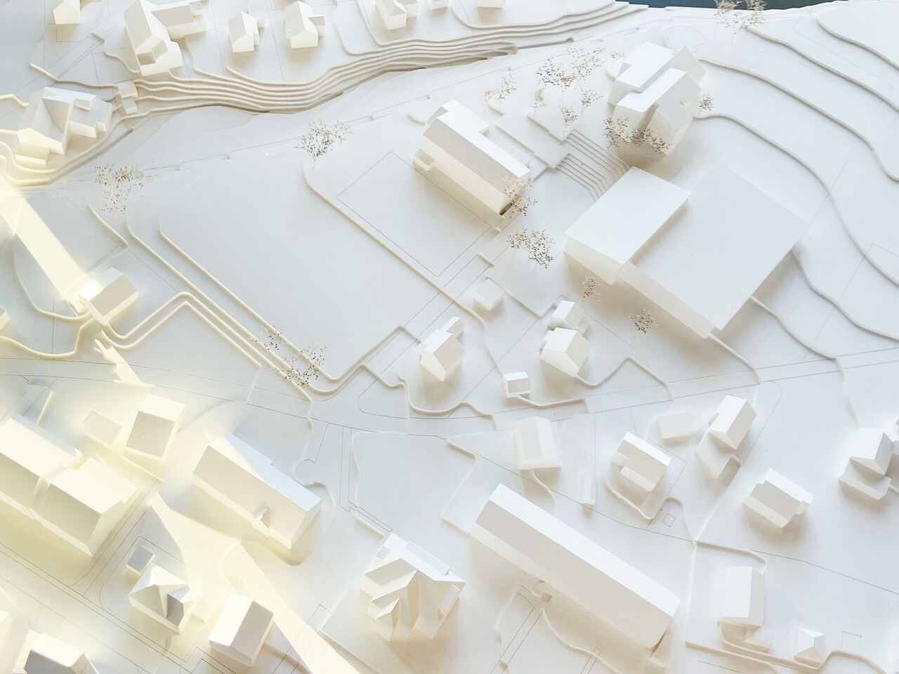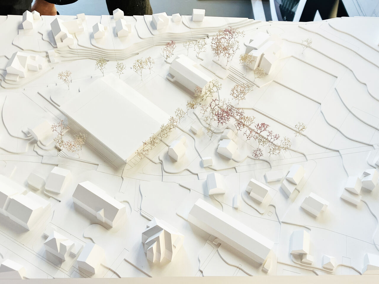 プレゼンボードに載せるイメージは模型写真というよりもレンダリングイメージが主流で、自社ではなく外注されることがよくあります。石膏白模型は敷地部分だけ取り外せられるようになっており、プロジェクト部分を制作してそこに移植することになります。ここでも、模型の精度があった方が印象が良いので、ほぼ全ての設計事務所は模型屋さんに制作をしてもらいます。