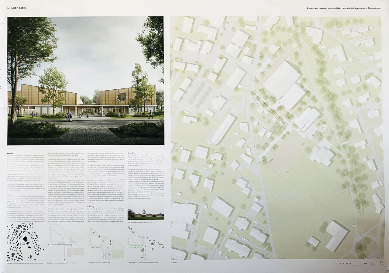 今回は、こうしたプレゼンボード(A0横づかい)を4枚まで提出することができました。写真は1等案の一枚目のプレゼンボードです。