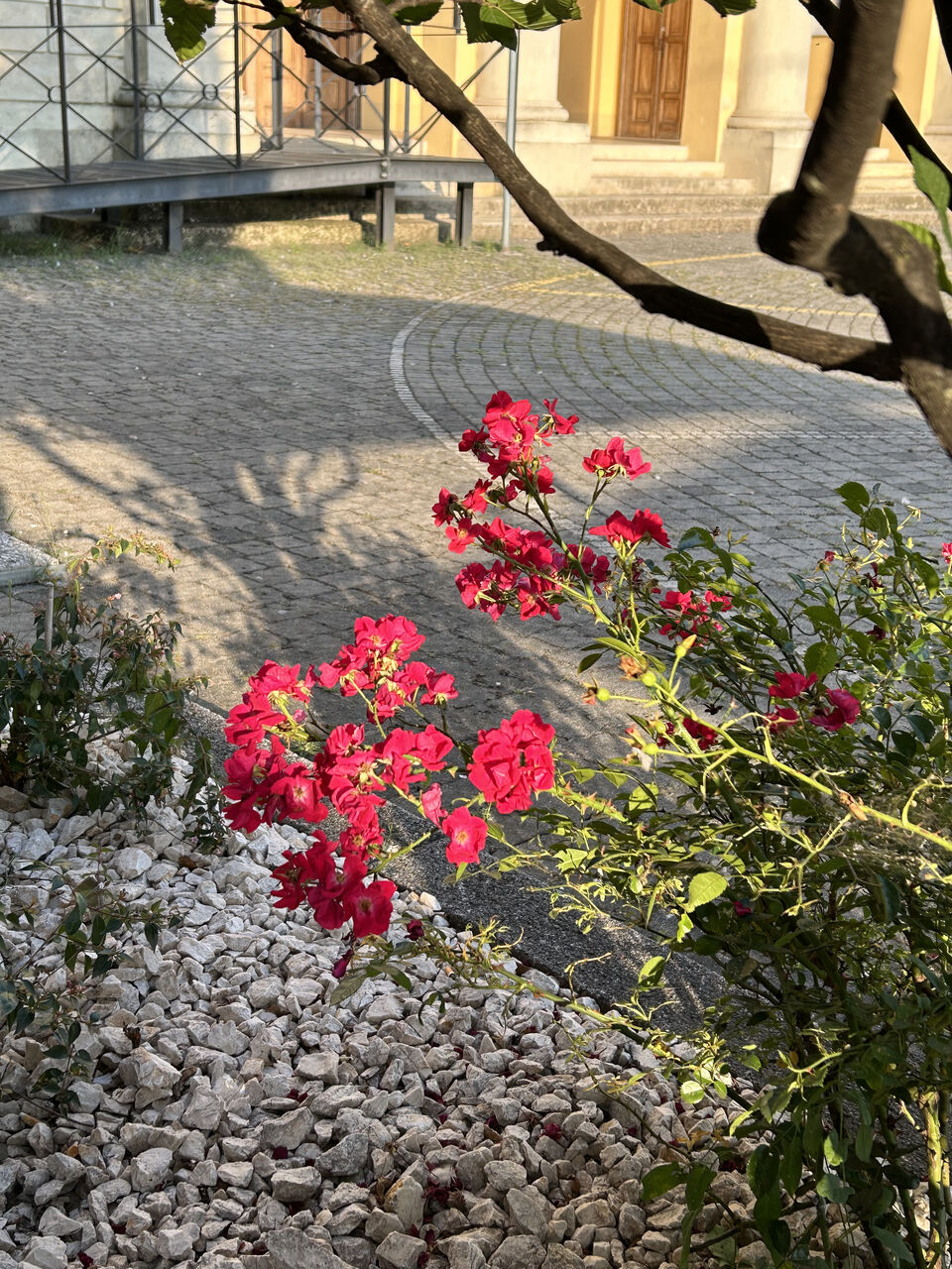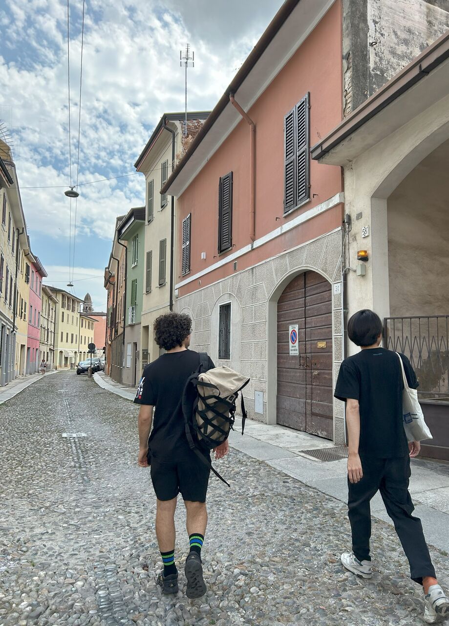 イタリアはおろか、ヨーロッパにも今回初めて降り立った自分は、パリから飛行機でやってきてくれた友人・Iとその友人・Tに頼りきりで会場を訪れた。ベルガモの街からわざわざ車を走らせてくれた二人には感謝してもしきれない。さあさあ、みんなでワインを飲もう!というようなイタリアらしい陽気なBGMと共に真夏のクレモナに到着すると、黄緑、黄色、ピンクといったパステルカラーの可愛らしい建物がずらりと並んでいた。バカンス期間ということもあってか、石畳の路上にはほとんど人がいない。メカスが飼っていた2匹を思い出すような黒猫がうろつくテラスでサラミやワイン、ピスタチオのリゾットを食した後、元教会を活用しているという上映会場「San Carlo Cremona」へと歩いた。