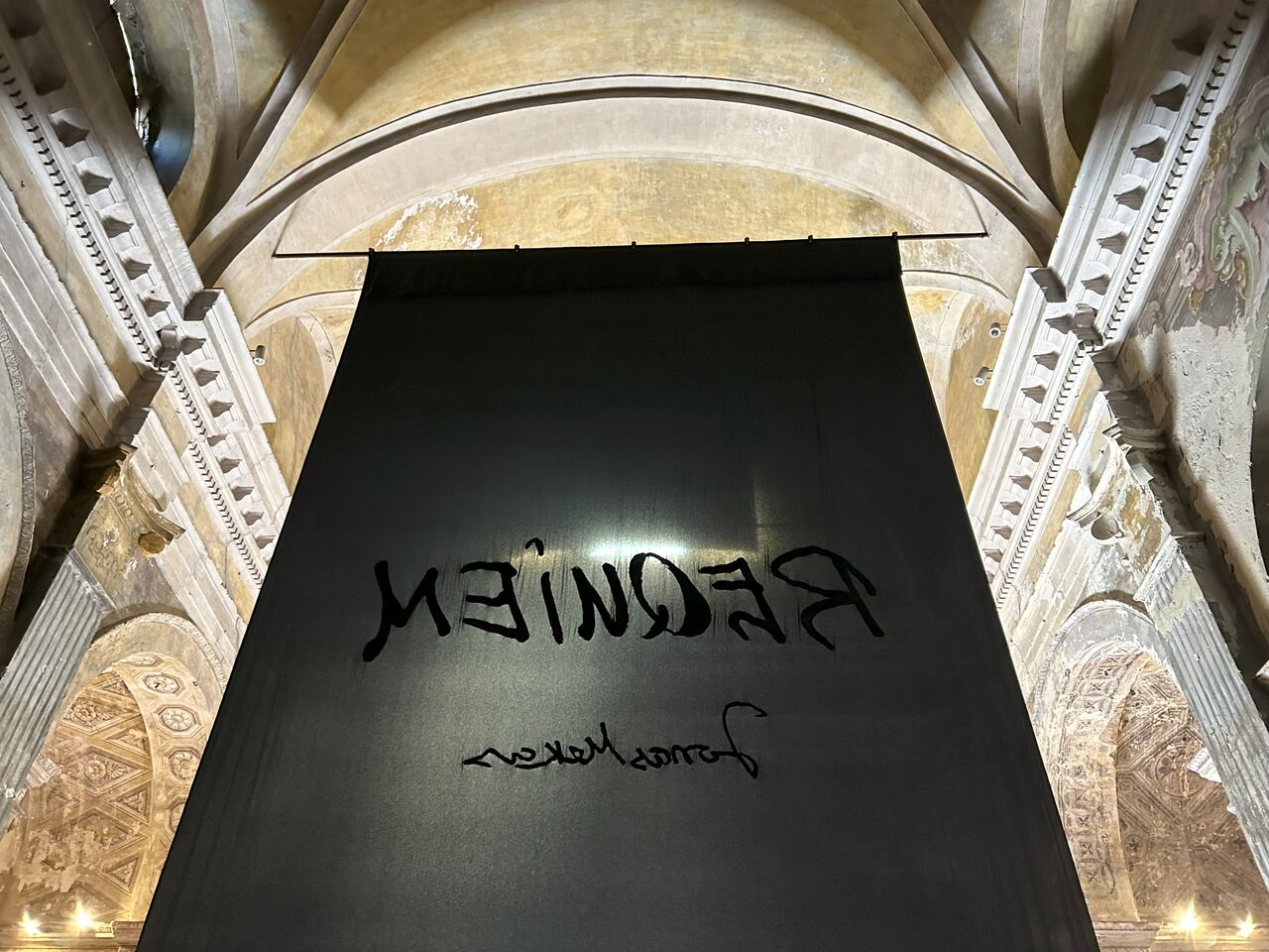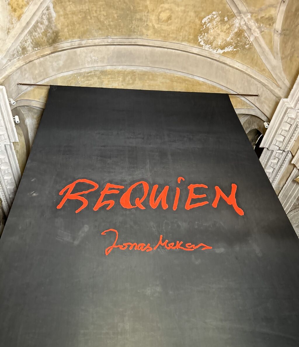 到着してまず驚いたのは、その天井の高さだ。いったい何メートルあったのだろう。見たことのない大きさの垂れ幕におなじみのメカスフォントで赤く「REQUIEM」と綴られている。