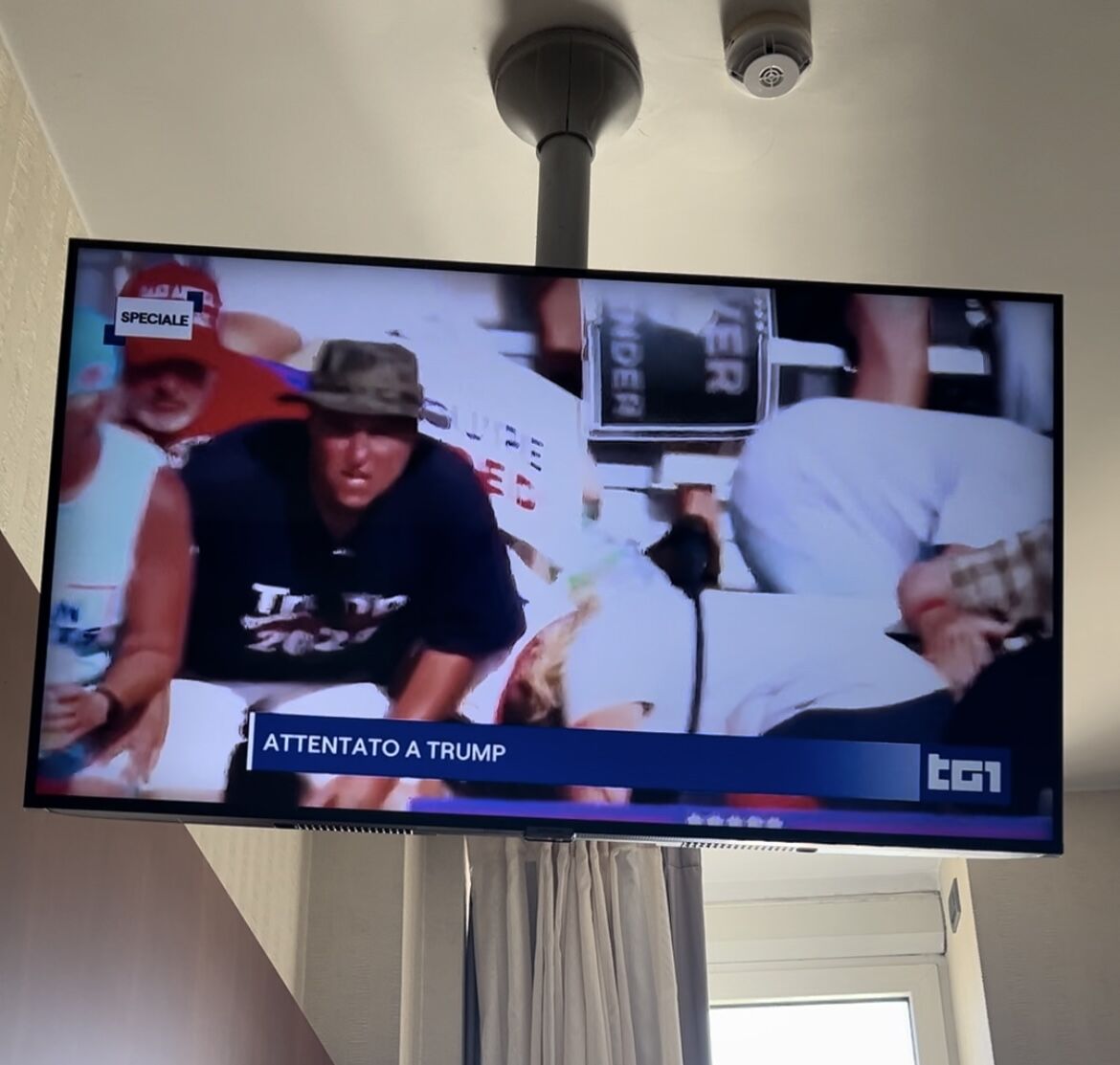 ジョナス・メカスが死者に捧げた鎮魂歌は、葉の上の水滴に反射して、今を生きる私たちの姿を照らし出す。翌朝、ドナルド・トランプが撃たれたニュースが流れているのを、私はミラノのホテルから撮った。