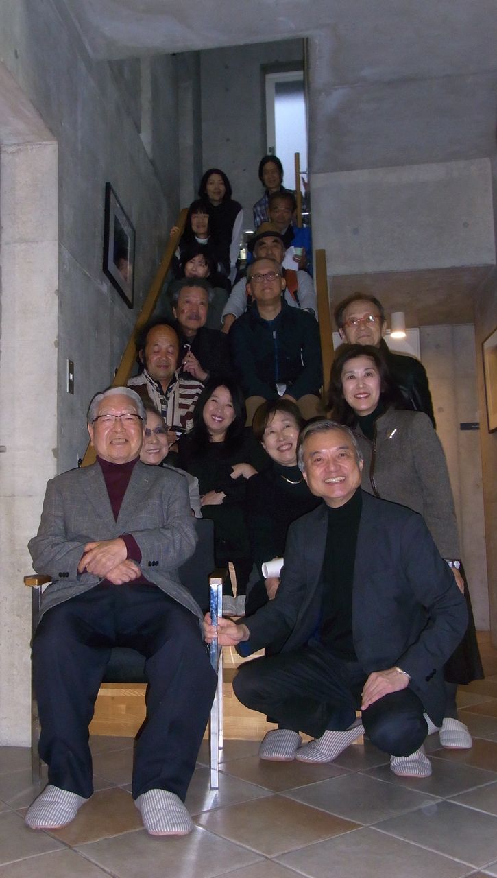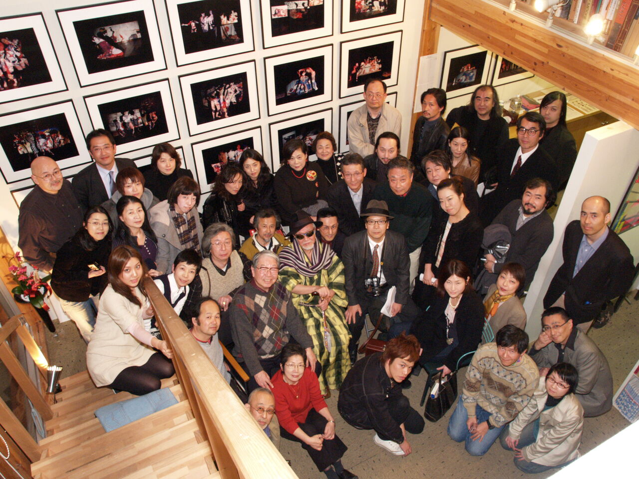 青山から駒込に移転して初めての細江英公写真展のオープニングの記念写真。細江先生の指示で二階から三階への階段に上れるだけ上がっていただきました。