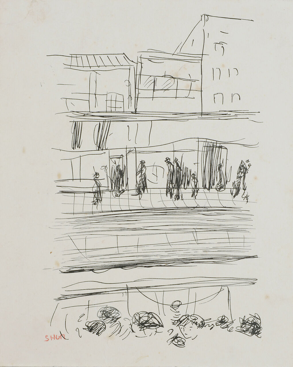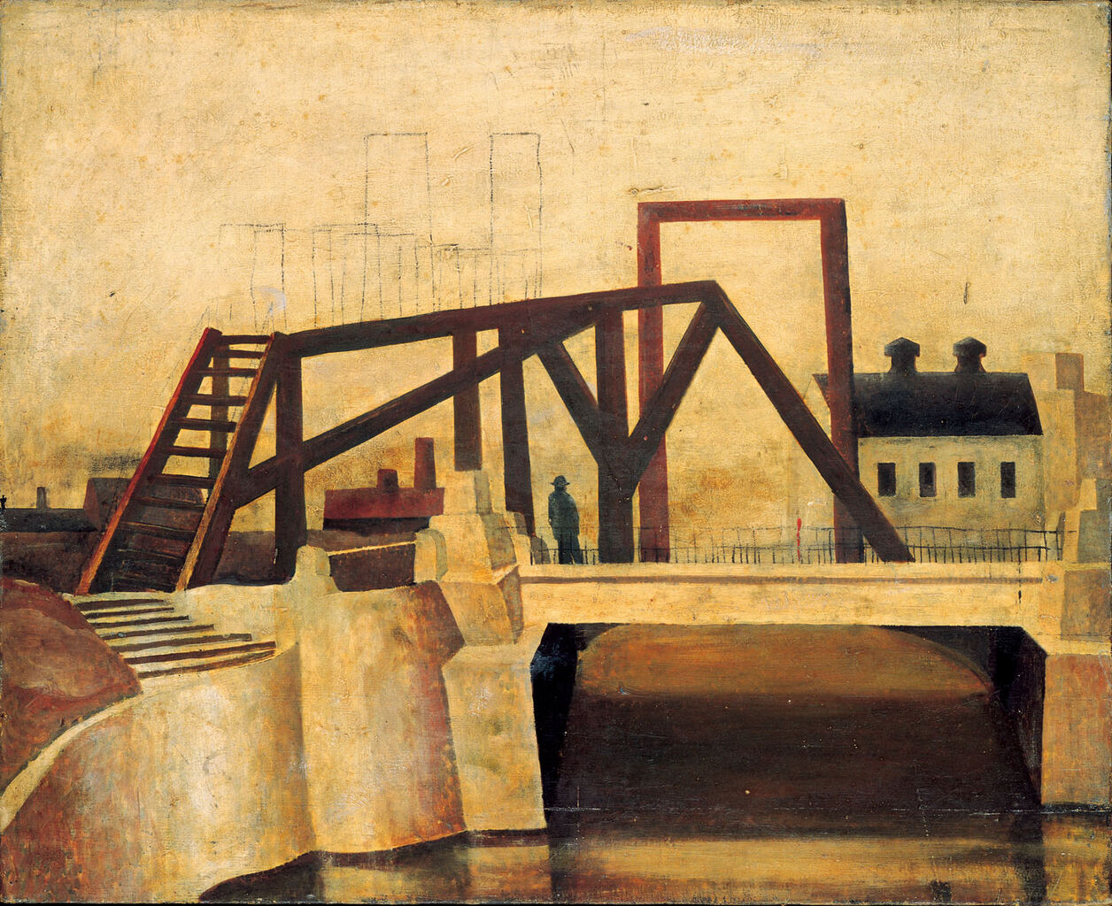 今回のメイン作品となる《構図》は、絵の具を自由に塗り重ねた上に、人や線路、建物を黒い線で簡略に描かれています。〈都会〉や〈郊外〉シリーズの終盤に生まれた作品であり、具体的なモチーフから抽象的な形態へと向かう思考の跡が垣間見えます。