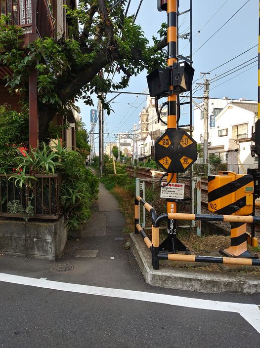 都電西ヶ原四丁目駅2~300m程手前「滝野川10号」踏切 濃い味わいの小徑 密集住宅玄関はみな線路向き なぜ? 庭未満の地面(無い家はプランター)はてんこ盛りの緑 なぜ? 生涯借家住まいの自分はわかる