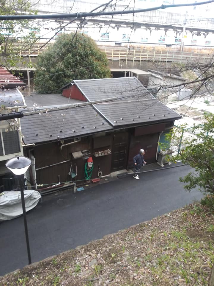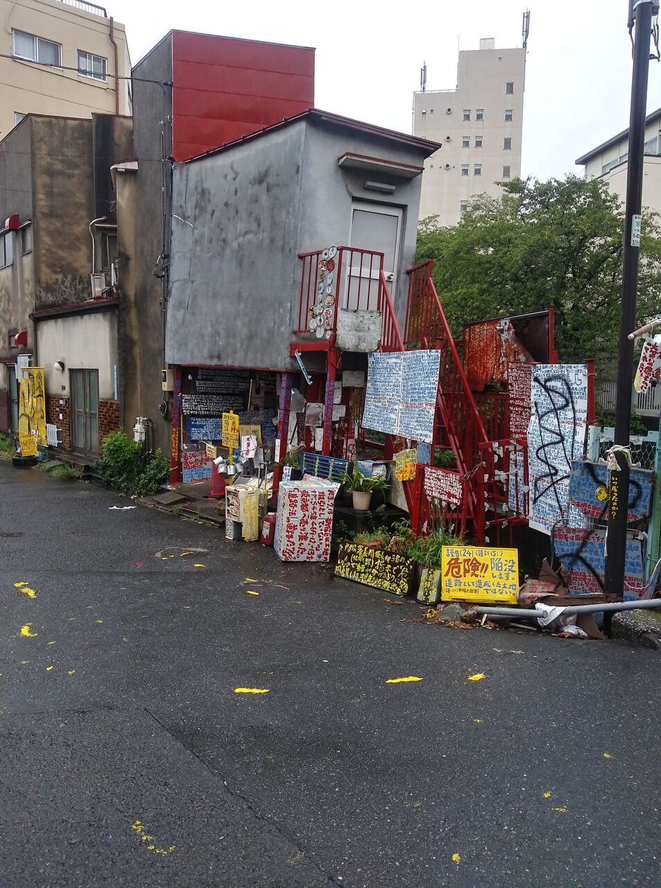 新堀橋(神田川)たもと 傾いた民家二軒 下落合駅ホームまで30秒 ムカシからこんな感じ 国(当時の建設省)・都・戸塚警察署等への抗議文で満艦飾 何度来て何回読んでも内容不明 けれど伝わる理不尽への怒り
