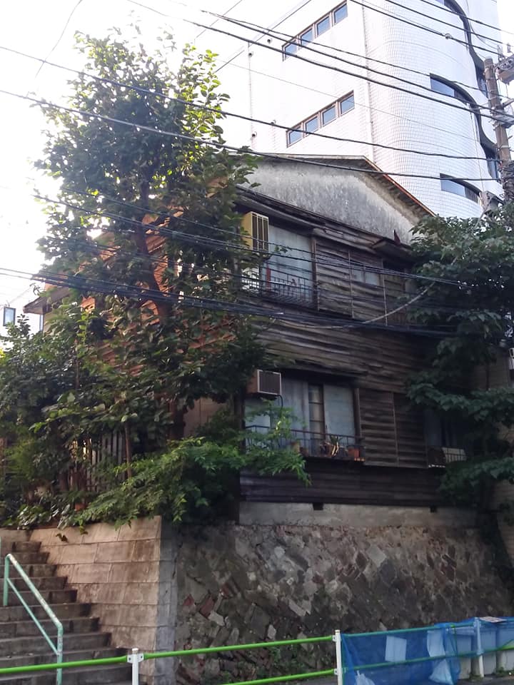 旧椎名町の”緑の要塞“ やっぱり木造かコンクリ造りかわからぬ だが白熱灯の明かりで室内がほの見える 確かにここは住居 扉や窓らしきガラスは彩色部分極小のステンドグラス もっと知りたい自分は変質者?