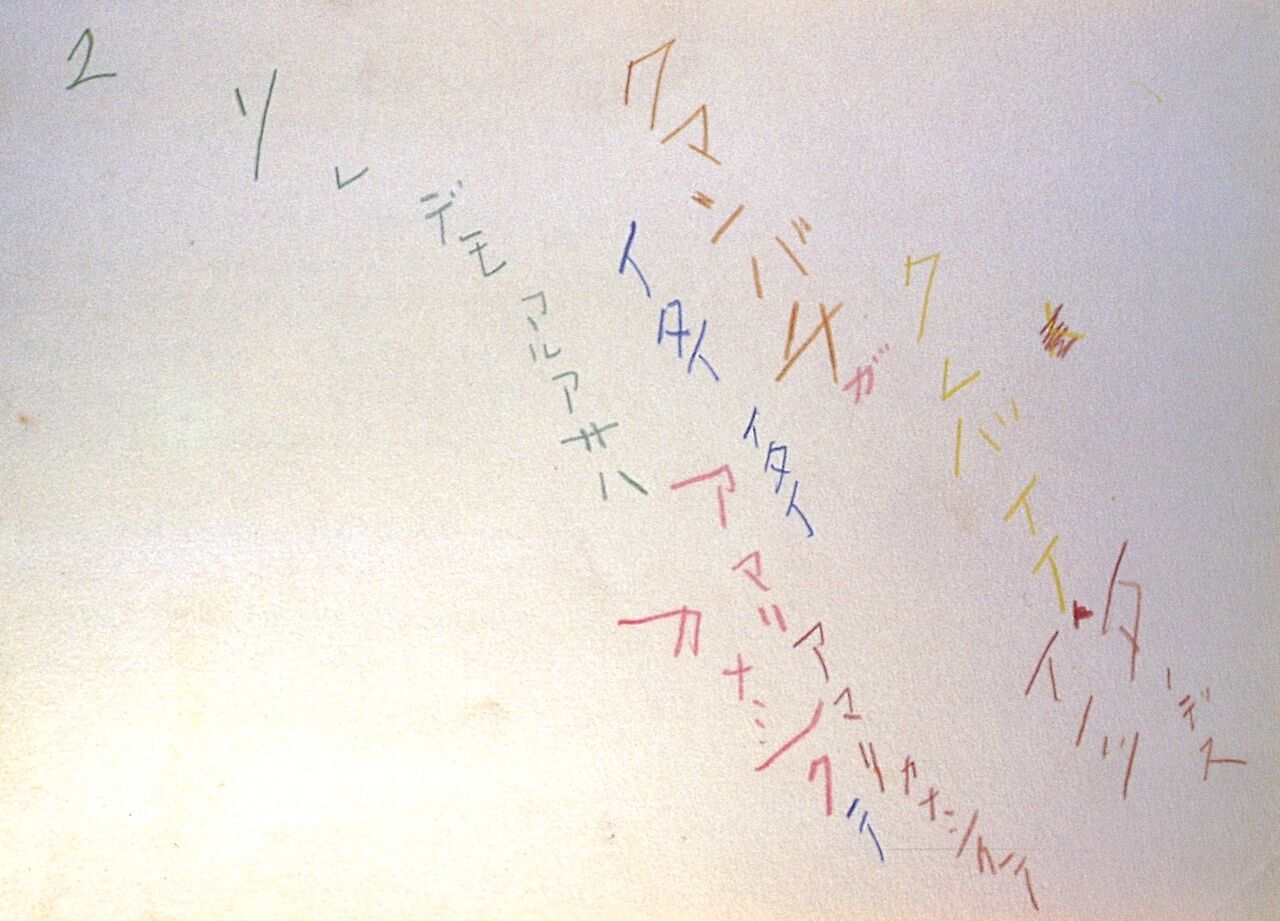 翌八日の朝、早く眼をさました瑛九は、次ぎ次ぎと赤、青、黄、緑などの色筆を手にとって、スケッチブックの二頁にわたって次の詩を書いた。」