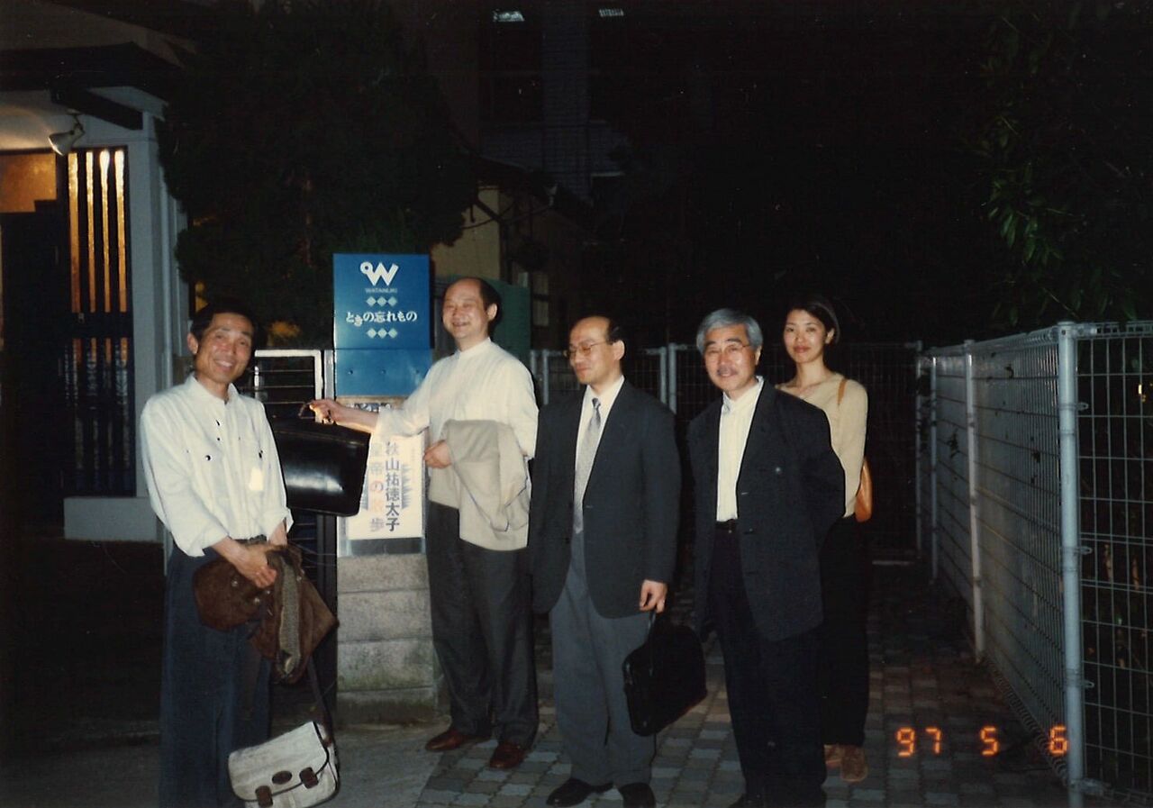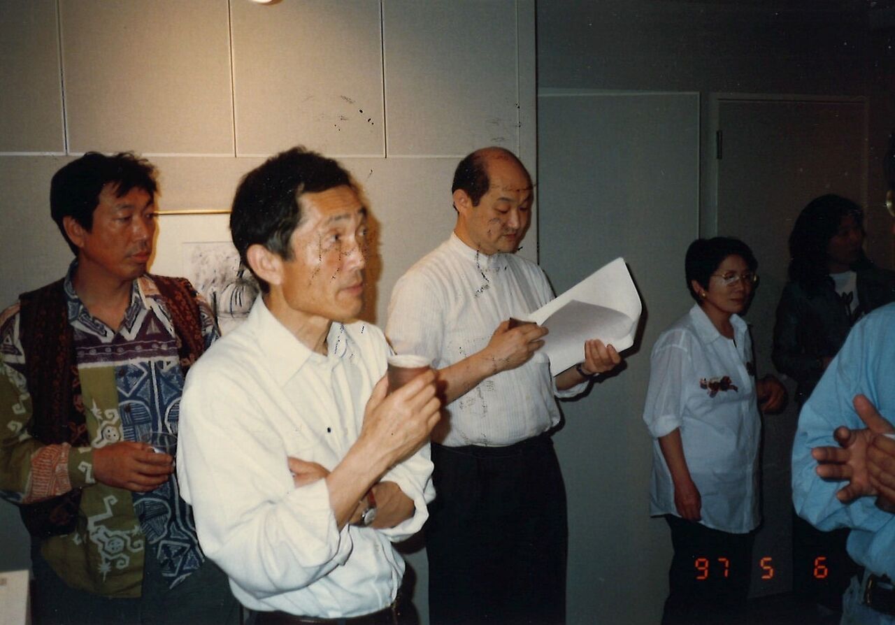 1997年5月6日「秋山祐徳太子 ー皇帝の散歩展(ブリキ彫刻とドロ-イング)」展オープニング、青山の一軒家時代の ときの忘れものにて左端が赤瀬川先生