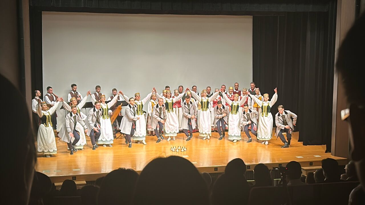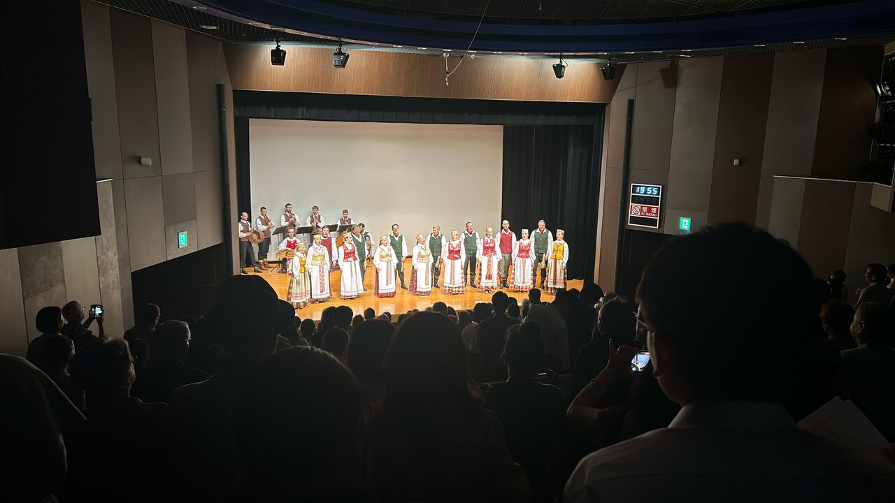 公演前に日本語で挨拶をされたリトアニア大使館、オーレリウス・ジーカス大使によれば、歌と踊りはリトアニア文化の中でも非常に重要な役割を果たしているそう。リトアニア独立の際には、ソ連占領下でも歌を歌い独立の機運を高める「歌の革命」が行われ、1989年に約200万人が600km以上に渡って手をつなく独立運動「人間の鎖」が起きた際にも、人々は自国の歌を自国の言語で歌っていたそうです。