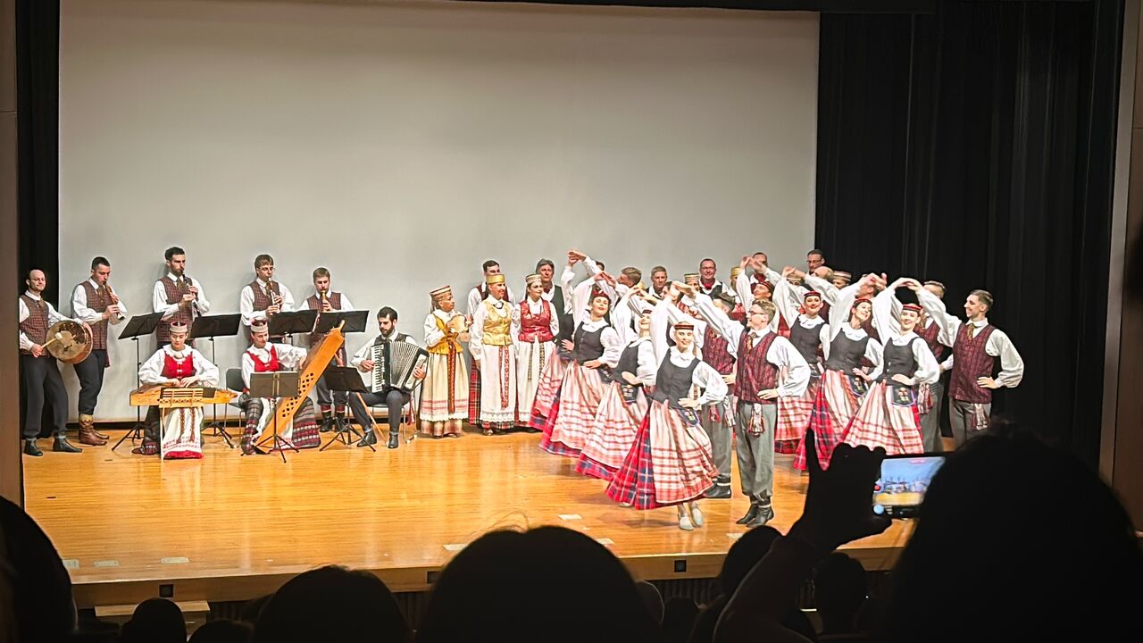 「ネムナス」はカウナス工業大学の学生とOBによって結成され、今年で75周年を迎えた由緒あるグループ。自然、労働、祭り、愛をテーマに民族音楽を奏で、歌や踊りを披露されています。全体で120人以上のメンバーがいるそうですが、今回は40人ほどの体制でパフォーマンスを披露してくださいました。
