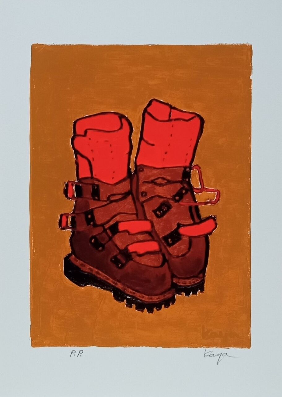 熊谷榧 岳人表紙シリーズより「山スキー靴」 刷り1983年