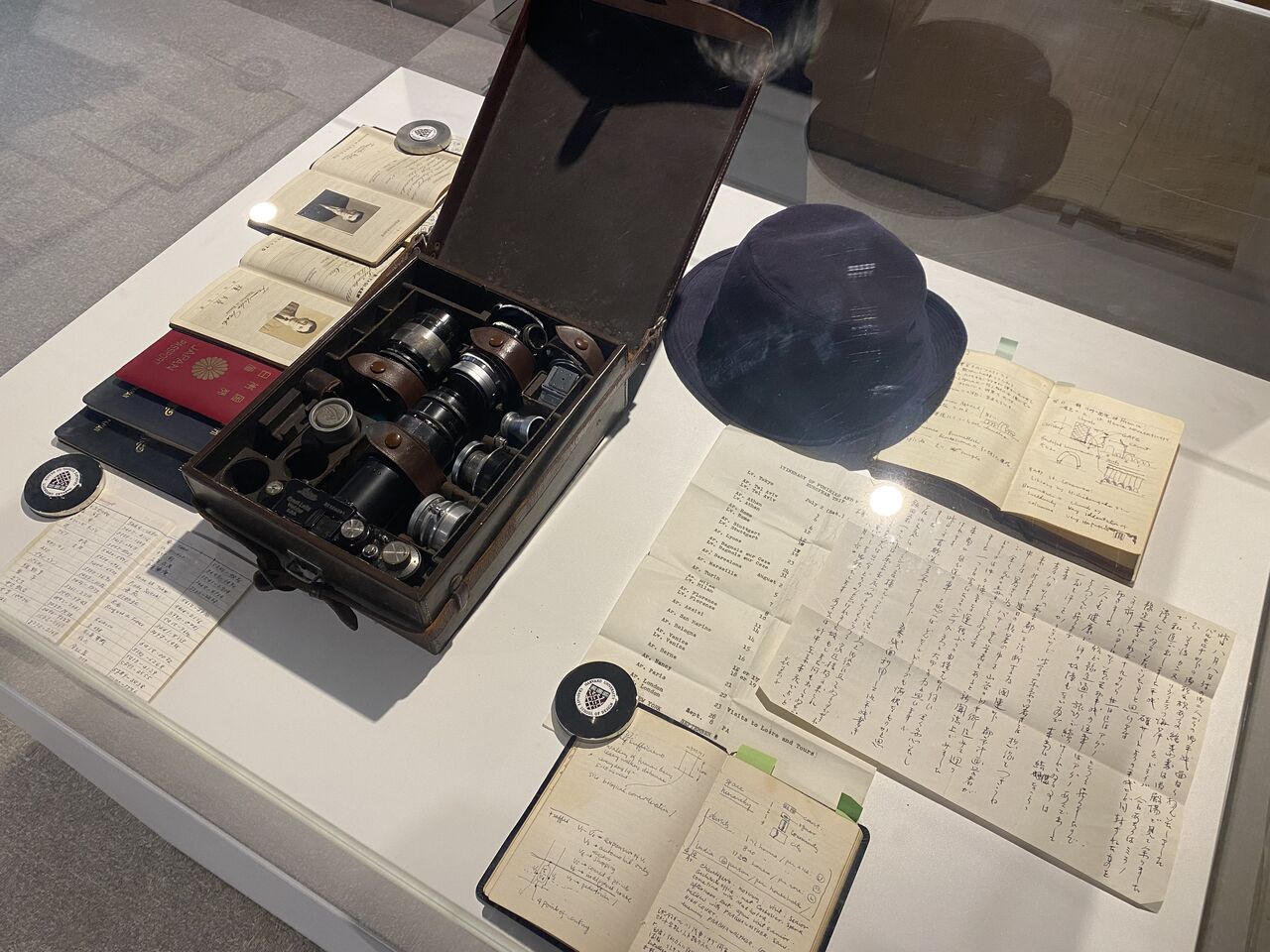 メモリアル会には、若かりし頃のお姿や奥様との写真パネル、遺品展示にはパスポートや几帳面に書かれた手書きのアドレス帳(レストランの電話番号など)、ライカのカメラとたくさんのレンズ、帽子、英語で書かれた手帳などがあり、お人柄がよく表れている素敵な私物でした。