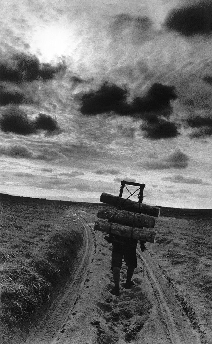 三本の大きな丸太を背負子に括り付け、右手に杖をもち、