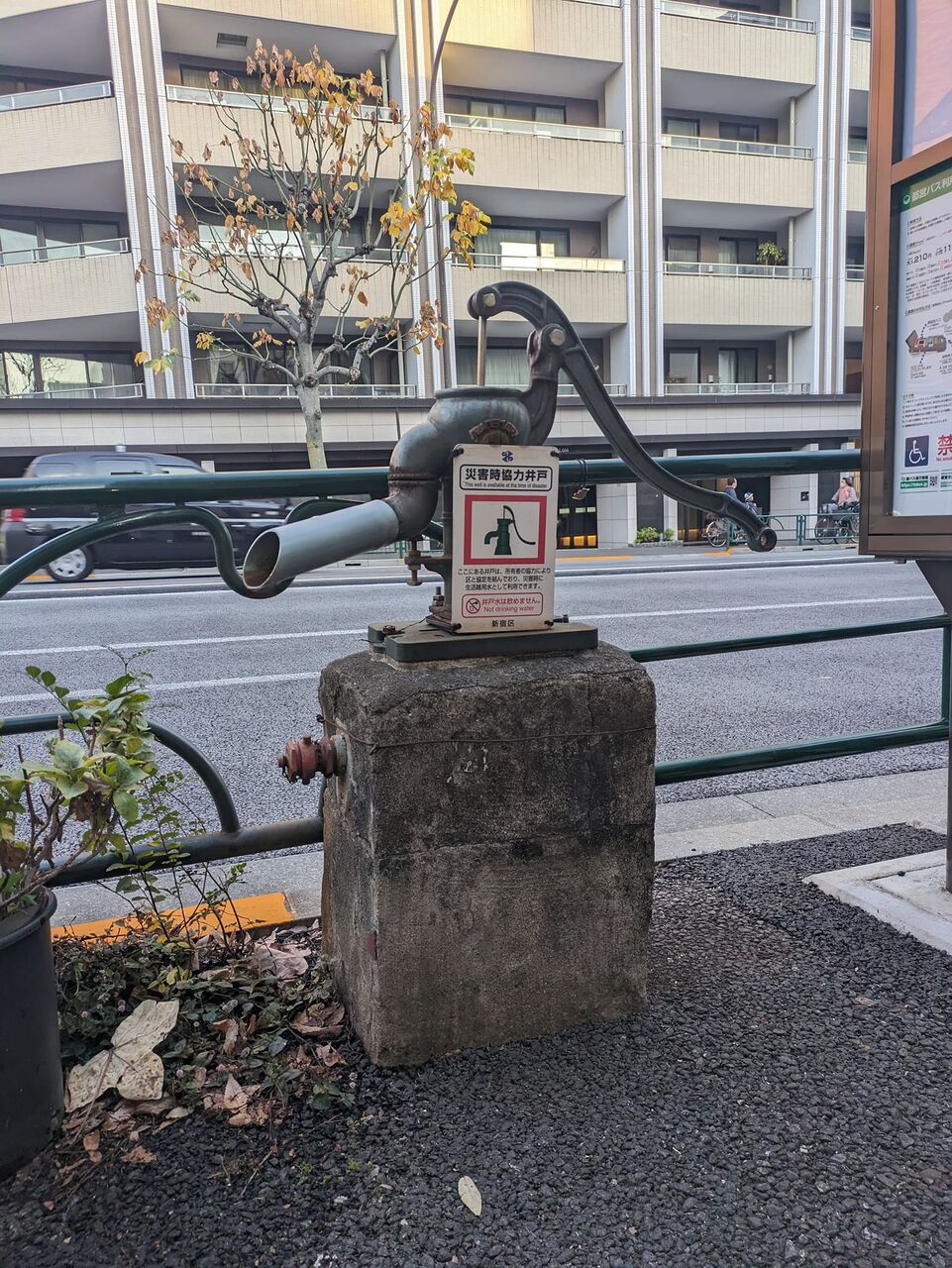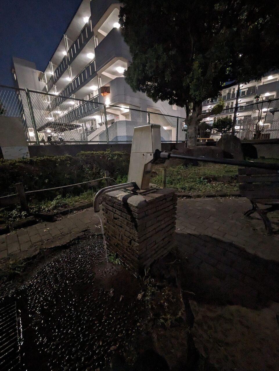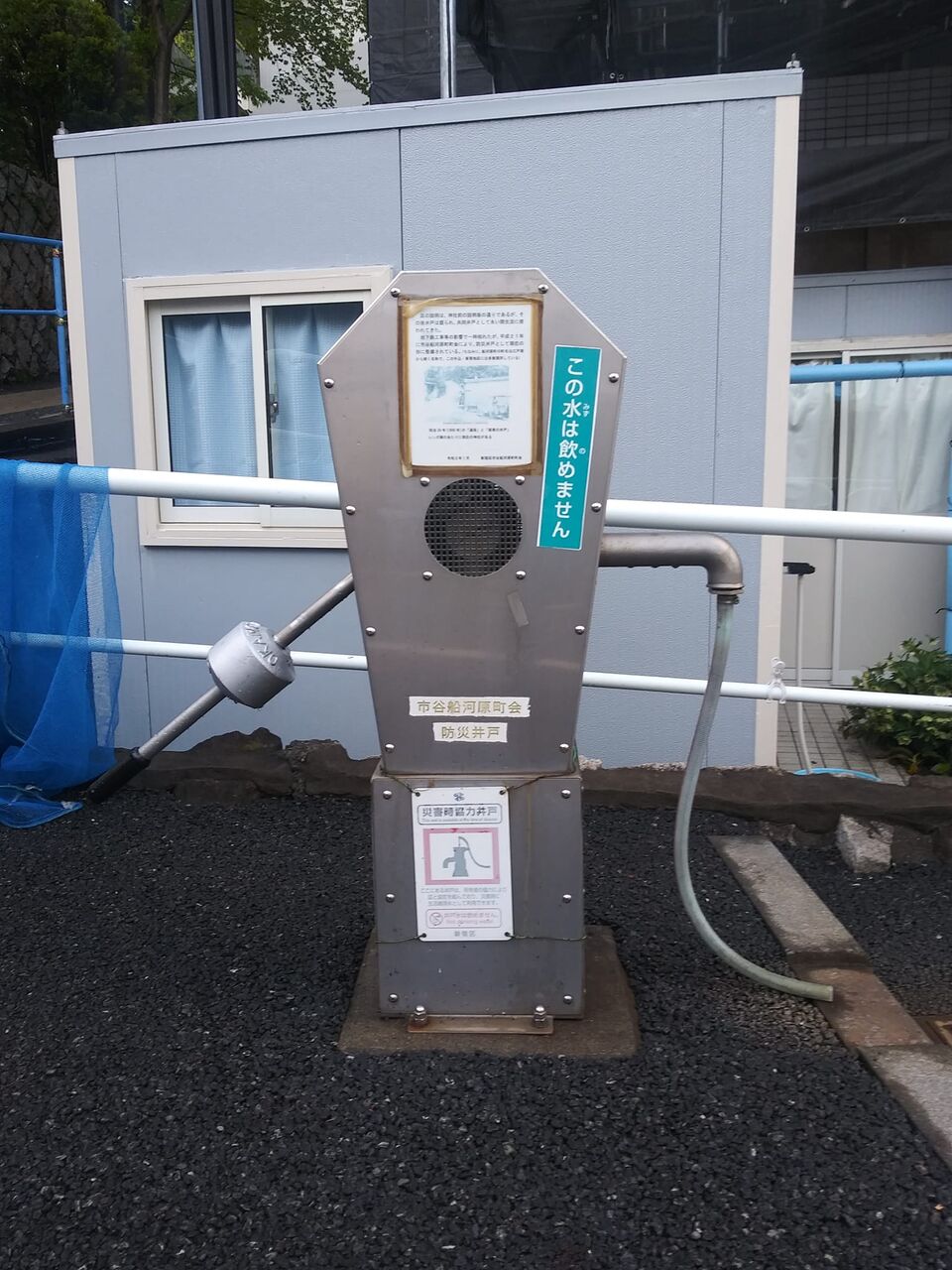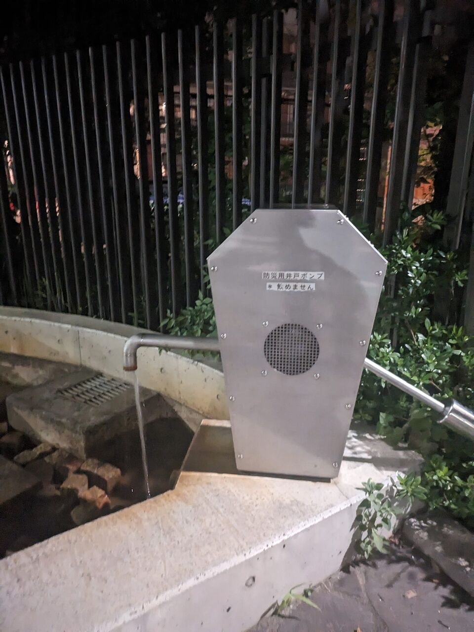 池袋第三小学校 フェンスで校庭を切り込んで設置 道路直面 誰でも使える災害対策用手動井戸 ギッコンジャーギッコンジャーの音もなく出て来る大量の水 それでも汲むのが楽しい もう1回だけでやめる