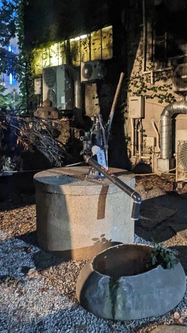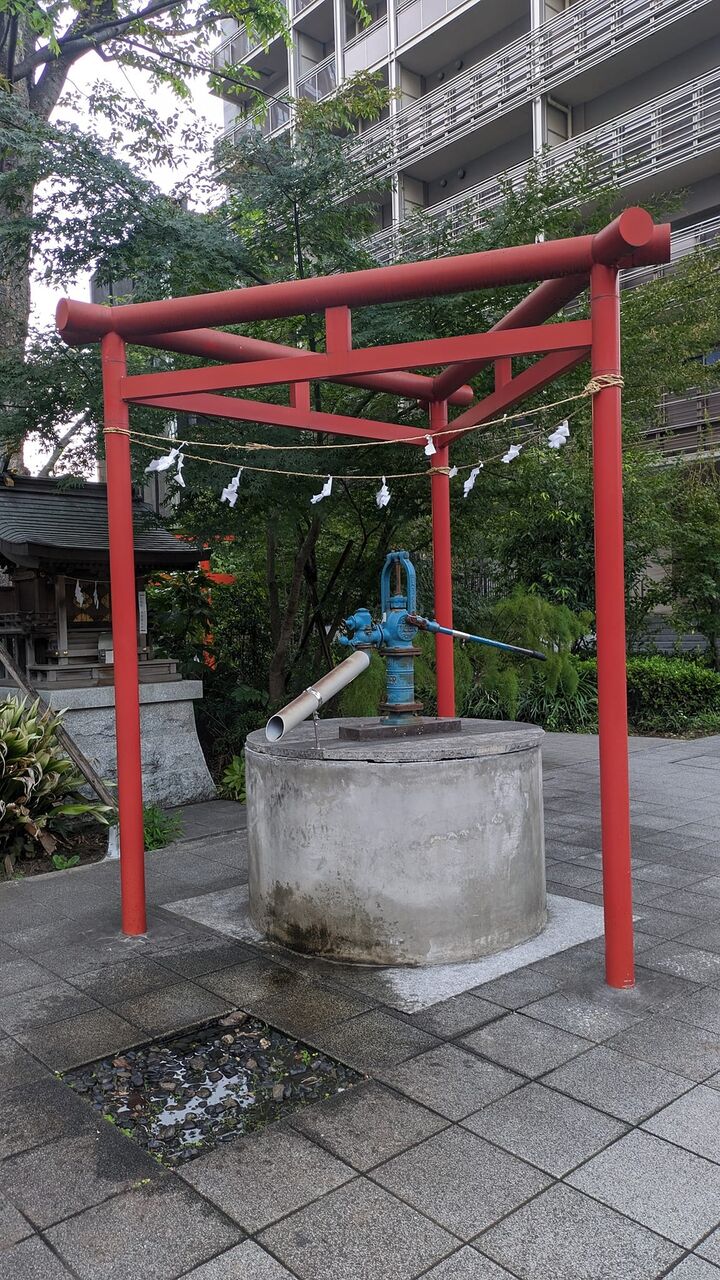 芸能神社(花園神社の境内社) 本殿脇にズンッと坐す 2019年に復活とのこと 手動なので災害時はきっと活躍 周りはビルがびっしり ほんの10m先の明治通りの下は副都心線 それでも地下水脈健在