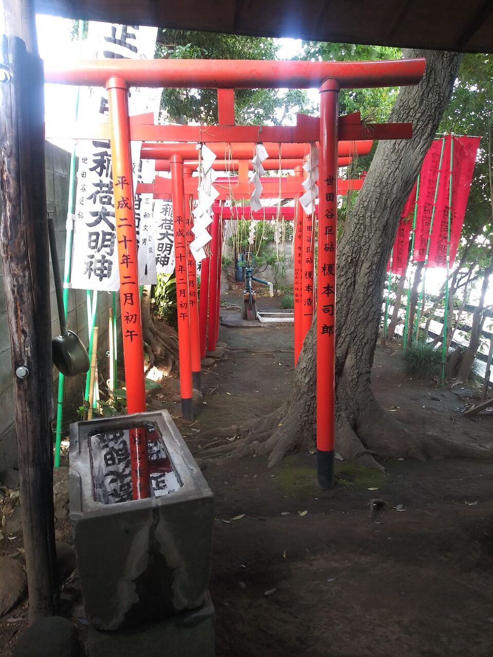 白玉稲荷神社 狭い境内の半分以上なのが六基の赤鳥居と井戸 井戸を祀る?(井戸のすぐ後ろは塀) 澄んだ手水鉢の水 鉢にこぼれた跡はあるが給水設備なし 鉢の底から湧水? 謎のまんまが楽しい