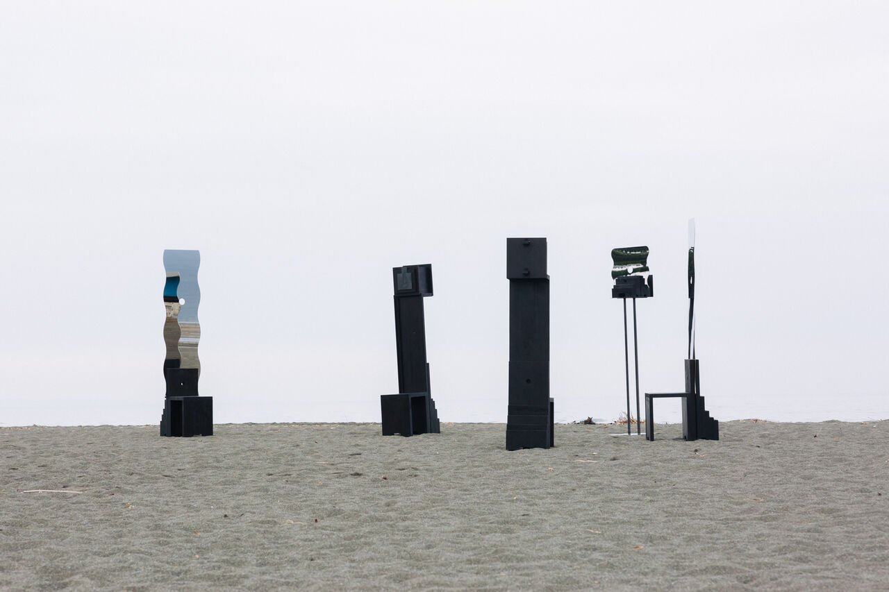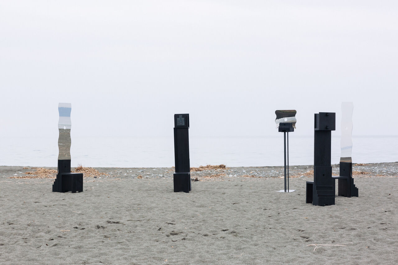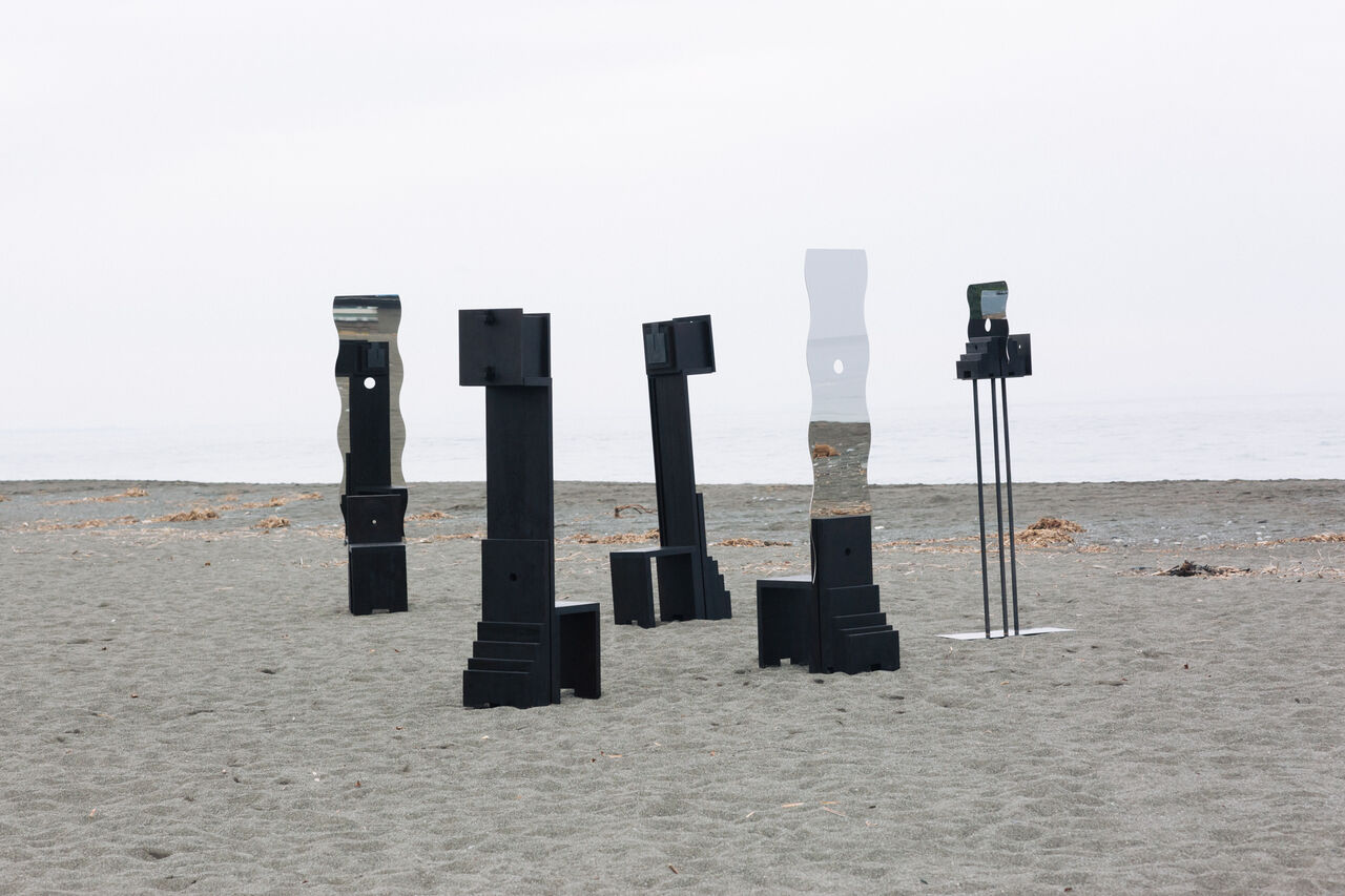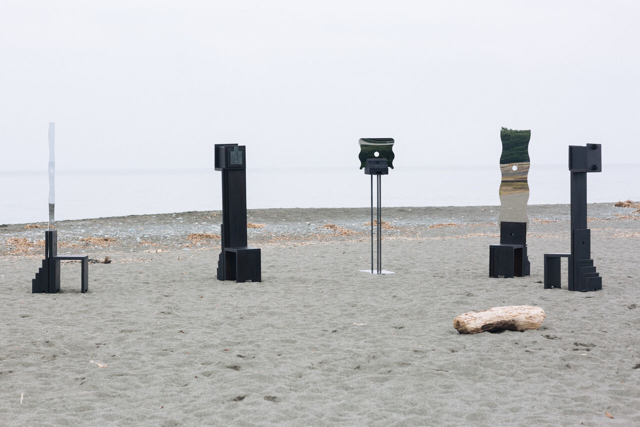 立体の撮影は、またコムラマイさんに依頼させてもらった。展示が始まる一週間前あたりに、神奈川県の小田原近くの酒匂海岸で撮影した。大急ぎで福島で準備をして、立体を軽バンにどうにか詰め込み(ちゃんと養生をして)、神奈川へと向かったのだが、朝到着のハズが結局昼前になってしまった。だがどうやらちょうど、朝のサーフィンと釣りをやっていた人々が引き上げていく頃で、人気が少なくなった曇り空の下、それなりに浮世な感のある写真が撮影された。黒く染めた木とのコントラストと、空と海に溶け込んで消えたり、突如として向かいの高速道路の映像をうつし出したり、面となったり、線となったりの、こちらが見る向きによって様々に変態するミラーに驚いた。