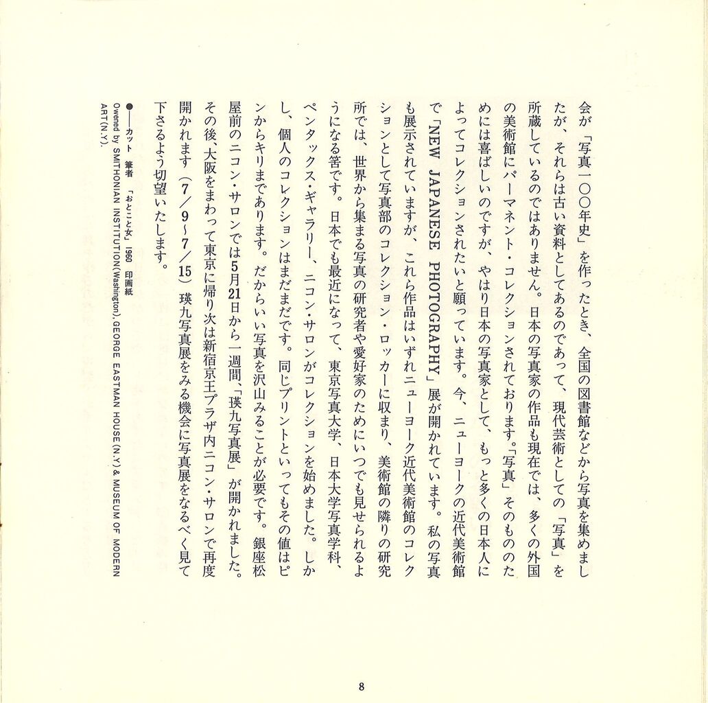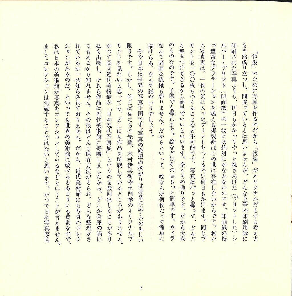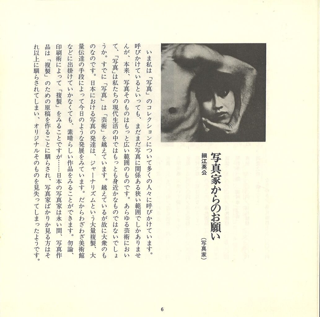 ときの忘れものの前身「現代版画センター」が発行していた機関誌『画譜』の創刊号には細江英公先生のエッセイが掲載されています。その名も「写真家からのお願い」。日本では写真がまだ印刷原稿と捉えられていた1960年代後半、アメリカでは写真が美術品としてコレクションされていることを知った細江先生は、写真家自身が製作するオリジナルプリントの重要性に気づき、写真教育、写真のパブリック・コレクションの形成など、社会的な活動にも注力されてきました。1974年5月に発表された「写真家からのお願い」では、先生ご自身の言葉でオリジナルプリントの重要性を訴えられています。