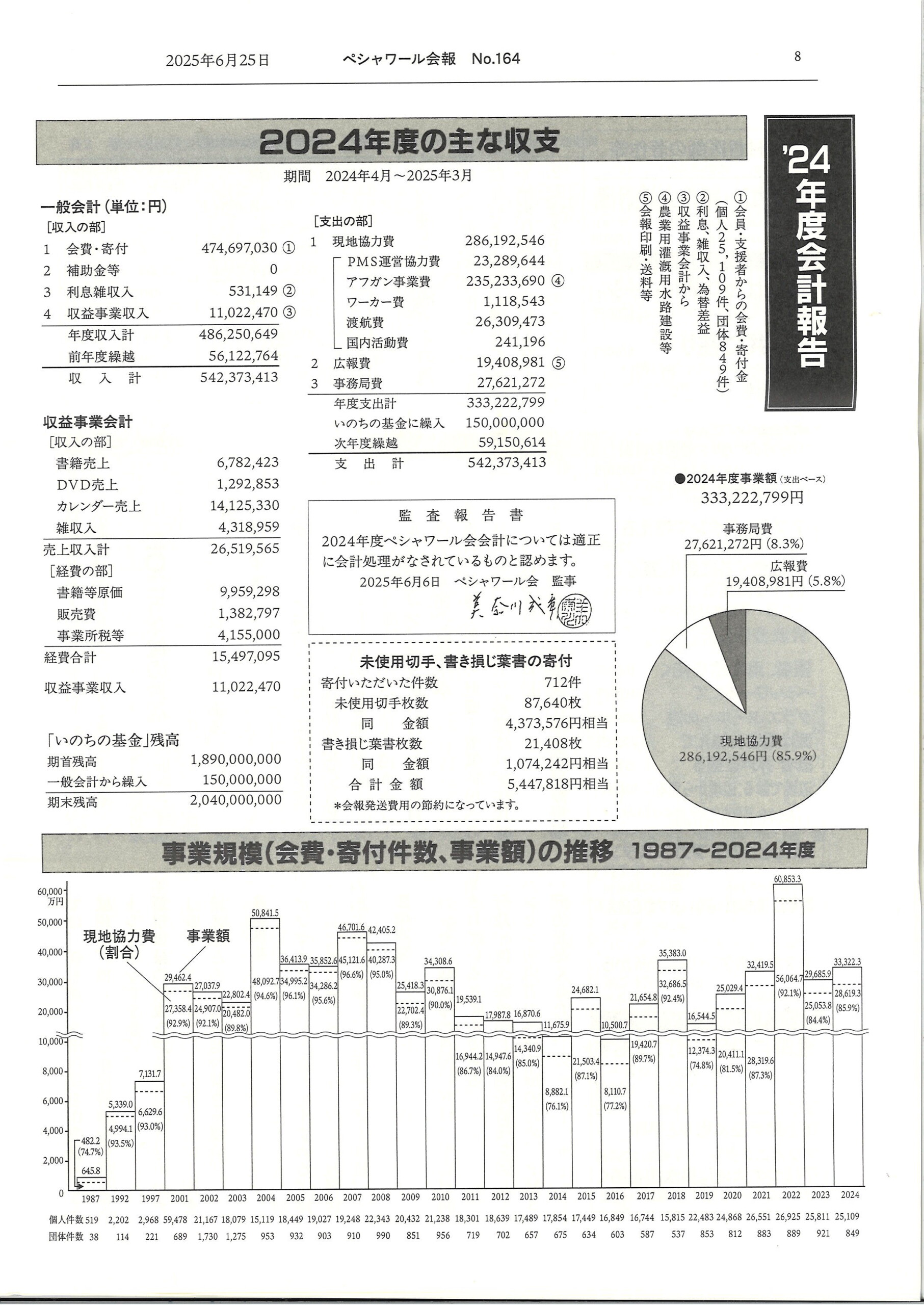 今年6月に発行された「ペシャワール会報No.164」によれば、昨年は個人25,109件、団体849件からの会費・寄付金が寄せられ、事業額の85.9%が現地協力費に充てられたのだそう。