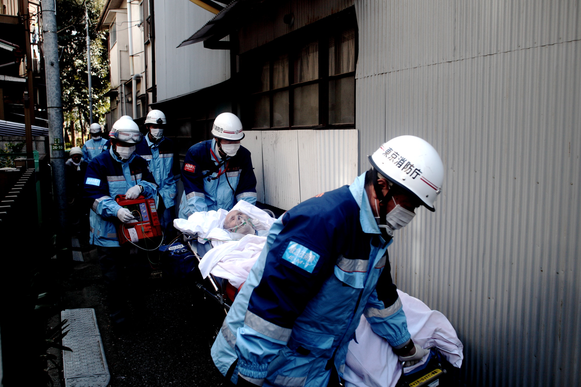 ph10 旧日光街道東側。救急車の入れない路地。担架で患者を搬送する。千住仲町26。2010.2.8