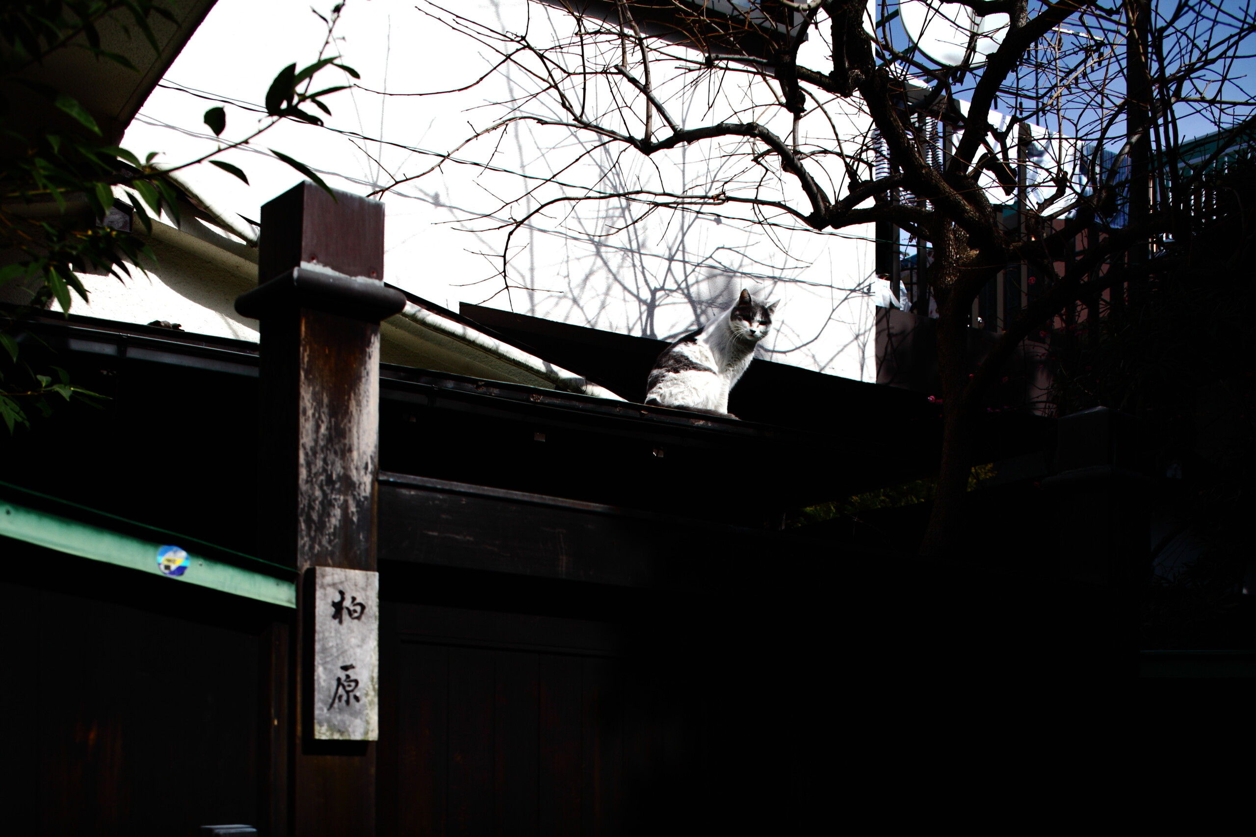 ph11 旧日光街道東側の路地。塀のうえにネコ。路地裏の天国。千住仲町25。2010.2.8