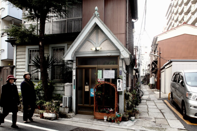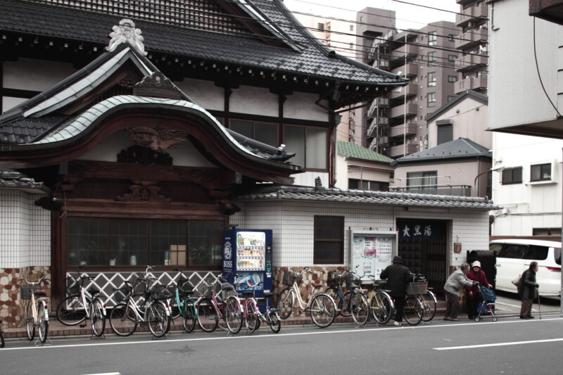 大黒湯は2021年6月というから、大橋眼科と同じ年に、閉店した。写真はそれより11年前の撮影になる。正面の駐輪場には自転車がずらりとならんでいて、繁盛しているようにみえる。しかし自転車が多いのは、利用客の多くが遠方からやってきていることを意味する。周りをみれば、再開発が進んでいることが分かる。手前の低層住宅の人たちもその奥に立ちならぶ中層のマンションの人たちも、いまや銭湯を必要としないのである。