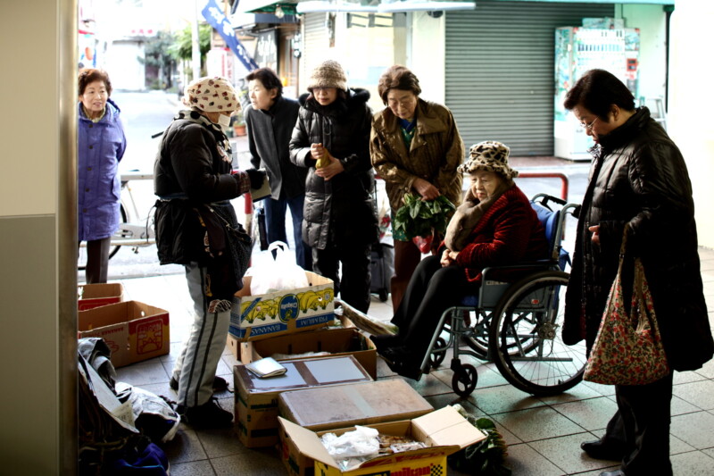京成千住大橋駅の改札を出ると、担ぎ屋のおばさんが店を開くところで、周りを常連と思われる女性たちがとり囲んでいた(ph2)。カメラをとり出すと、撮るのはかまわないが、許可をもらっていないから、正面から撮らないでほしいという。
