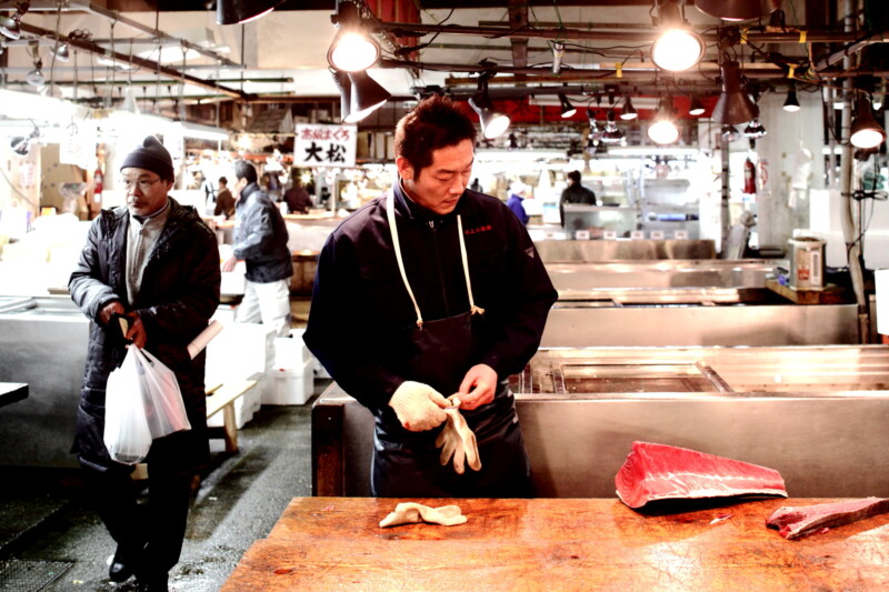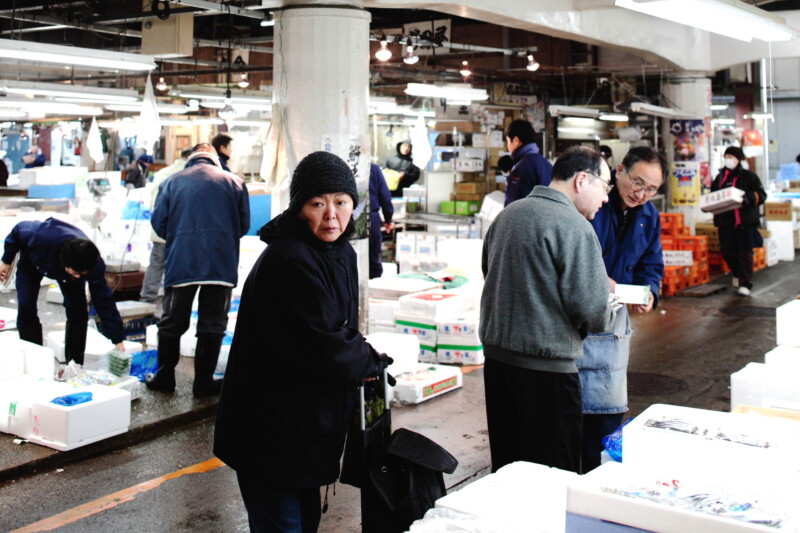 市場をのぞいてみると、10時を過ぎていたから、とっくに競りは終わっていた。人影もまばらで、後片づけをしている店も多かった。そんな市場の一画で、一人もくもくとマグロを捌いている職人さんがいたので、写真をとらせてもらった。よくよく見わたせば、小売か仲買か分からないが、女性も何人か目に入る(ph3、ph4)。行商は青物ばかりではない。むかしは魚の行商人にも女性が多かった。