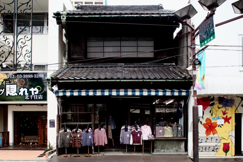ph5 旧日光街道。瓦葺き木造二階建ての石鍋商店。女性向けの洋服を店先にならべている。元は呉服店だったという。現在は店を閉じている。千住3-62。2010.2.8