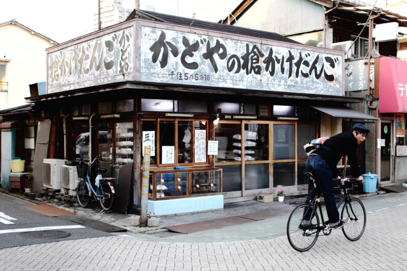 ph7 旧日光街道。かどや(槍かけだんご)。建替え前の旧店舗。店名は水戸光圀が入府のさい、近くにあった清亮寺の松に槍を立てかけた故事に因むとか。千住5-5-10。2010.2.8